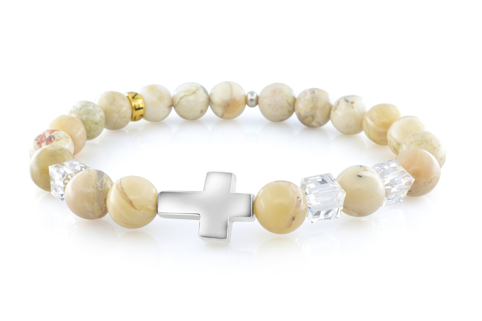 Our April Crystal African Opal bracelet is completely handmade with natural 8mm African Opal gemstones. This piece is designed around three stunning 6mm Swarovski clear crystal cubes and a premium 925 sterling silver cross. Our signature Gemvius 24k gold vermeil spacer is added near the back as a mark of where the piece was created.