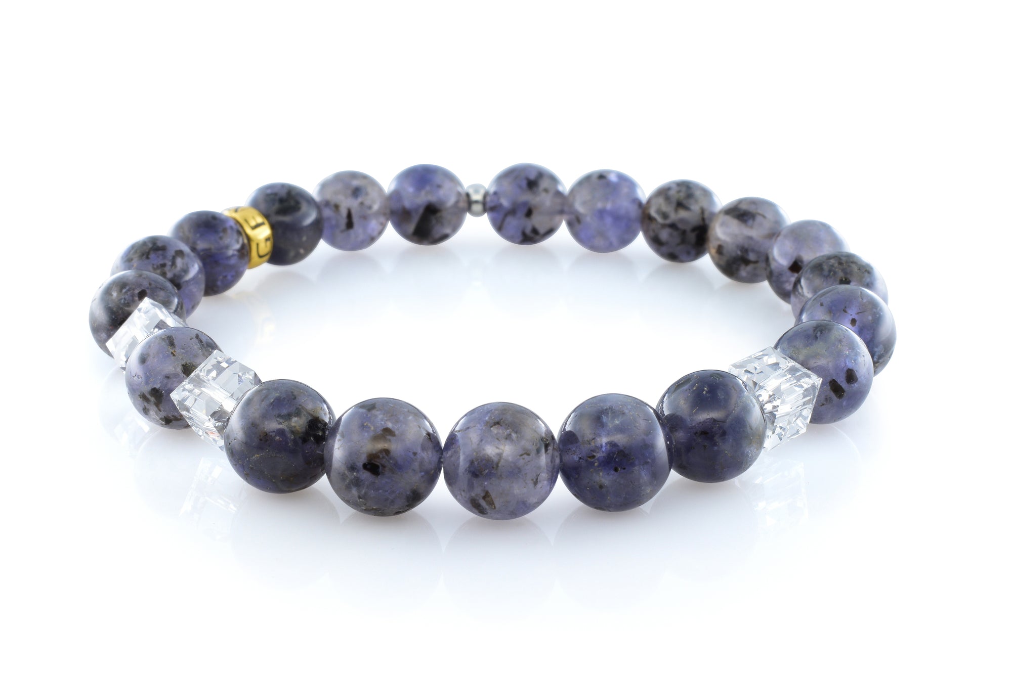 Our April Crystal Iolite bracelet is completely handmade with natural 8mm Iolite gemstones. This piece is designed around three stunning 6mm Swarovski clear crystal cubes. Each crystal cut and polished to perfection. Our signature Gemvius 24k gold vermeil spacer is added near the back as a mark of where the piece was created.