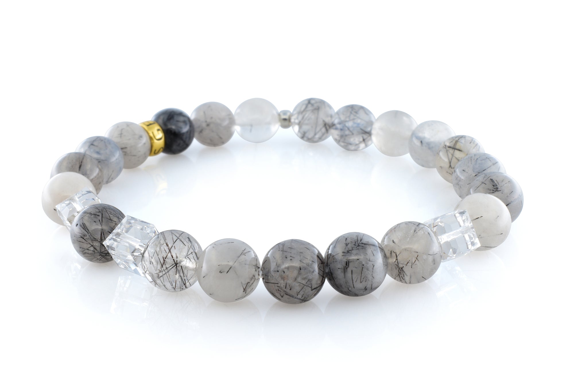 Our April Crystal Tourmalinated Quartz bracelet is completely handmade with natural 8mm Tourmalinated Quartz gemstones. This piece is designed around three stunning 6mm Swarovski clear crystal cubes. Each crystal cut and polished to perfection. Our signature Gemvius 24k gold vermeil spacer is added near the back as a mark of where the piece was created.