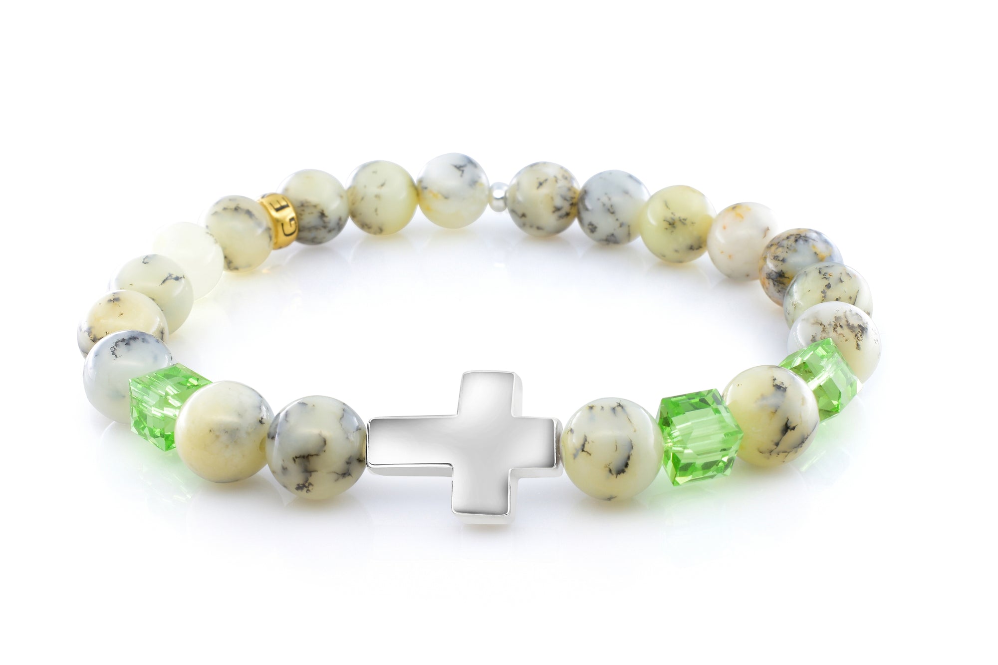 Our August Peridot African Opal bracelet is completely handmade with natural 8mm African Opal gemstones. This piece is designed around three stunning 6mm Swarovski peridot crystal cubes and a premium 925 sterling silver cross. Our signature Gemvius 24k gold vermeil spacer is added near the back as a mark of where the piece was created.