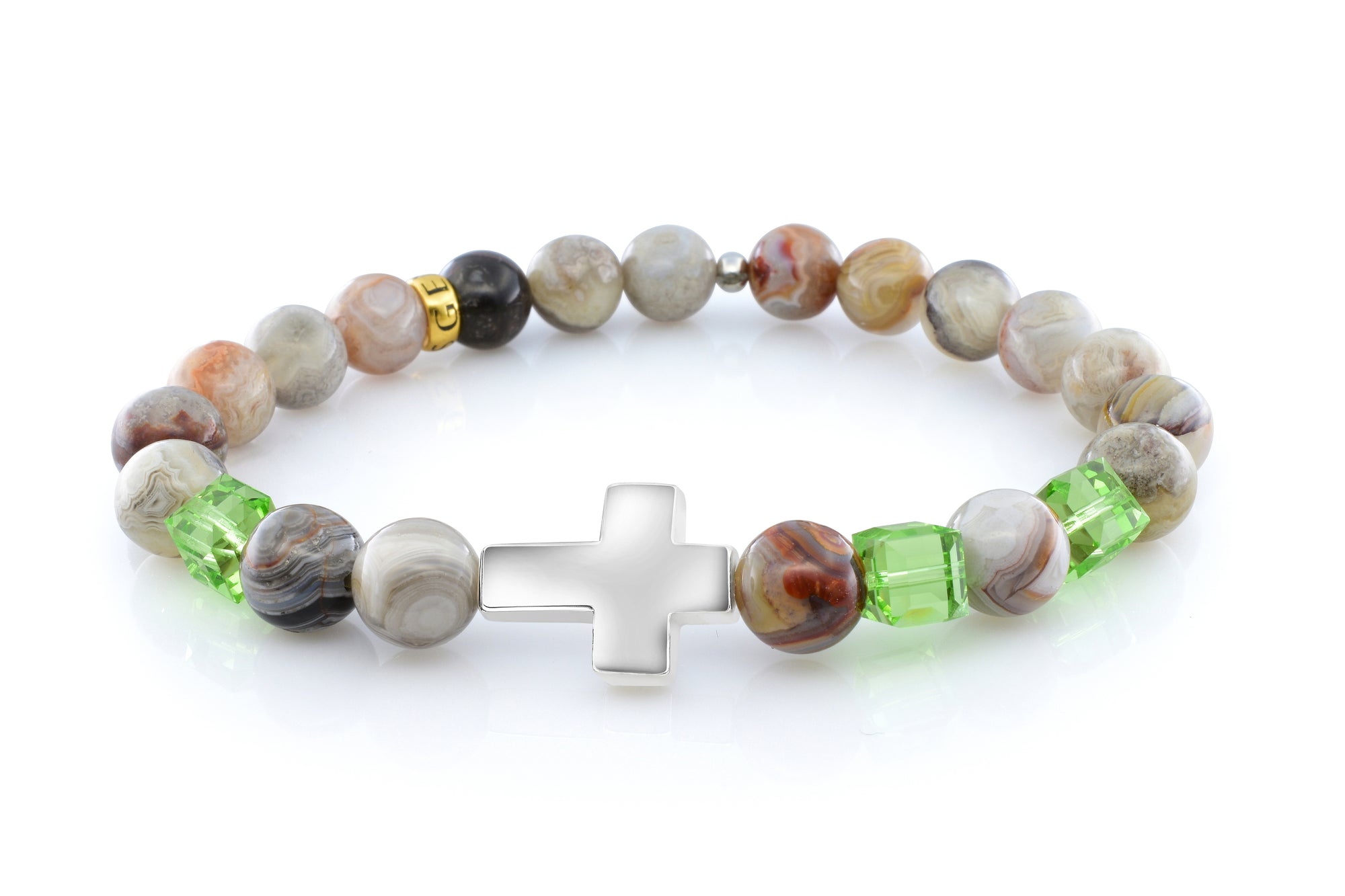 Our August Peridot Mexican Agate bracelet is completely handmade with natural 8mm Mexican Agate gemstones. This piece is designed around three stunning 6mm Swarovski peridot crystal cubes and a premium 925 sterling silver cross. Our signature Gemvius 24k gold vermeil spacer is added near the back as a mark of where the piece was created.