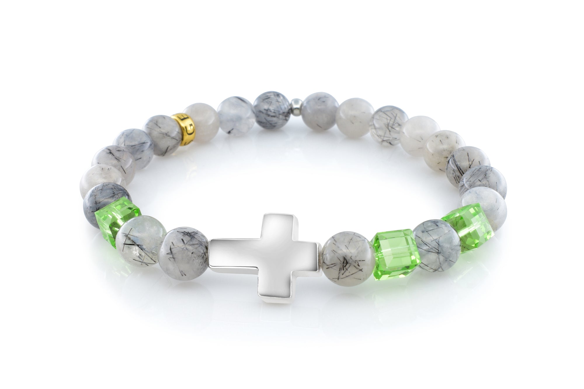 Our August Peridot Cross Tourmalinated Quartz bracelet is completely handmade with natural 8mm Tourmalinated Quartz gemstones. This piece is designed around three stunning 6mm Swarovski peridot crystal cubes and a premium 925 sterling silver cross. Our signature Gemvius 24k gold vermeil spacer is added near the back as a mark of where the piece was created.