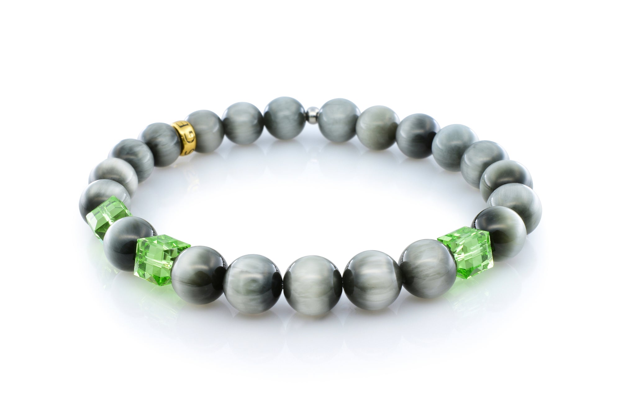 Our August Peridot Eagle Eye bracelet is completely handmade with natural 8mm Eagle Eye gemstones. This piece is designed around three stunning 6mm Swarovski peridot crystal cubes. Each crystal cut and polished to perfection. Our signature Gemvius 24k gold vermeil spacer is added near the back as a mark of where the piece was created.