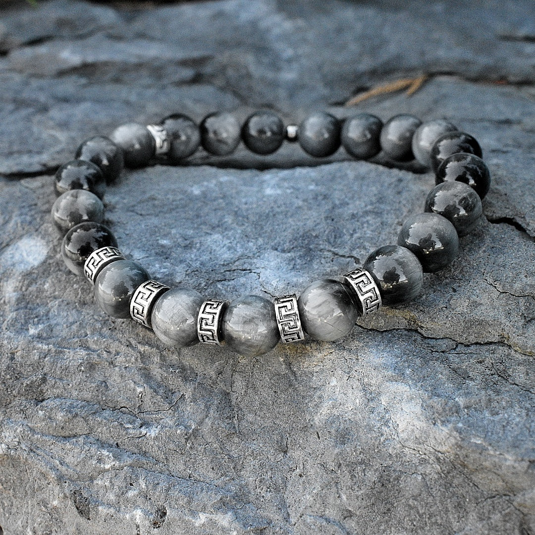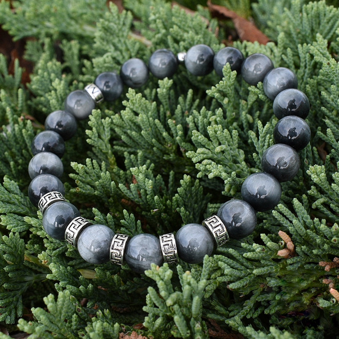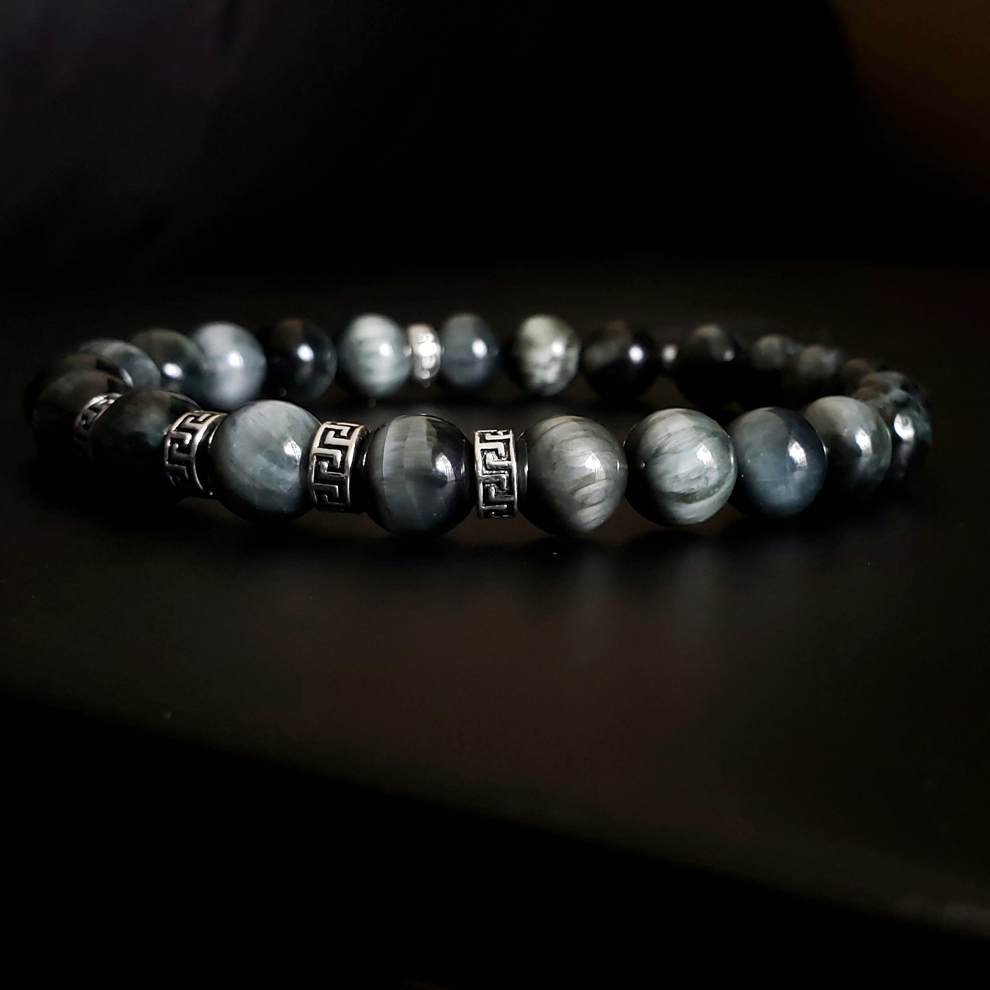 Our Penta Eagle Eye bracelet is completely handmade with natural 8mm Eagle Eye gemstones. This piece derives its name from the 5 distinct Greek spacers on the front of the bracelet. Each spacer is made of pure 925 sterling silver. Our signature Gemvius 24k gold vermeil spacer is added near the back as a mark of where the piece was created.