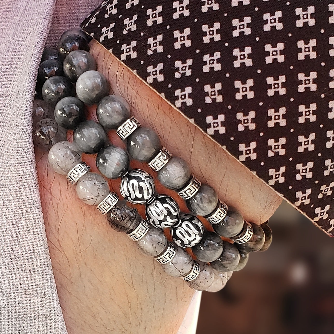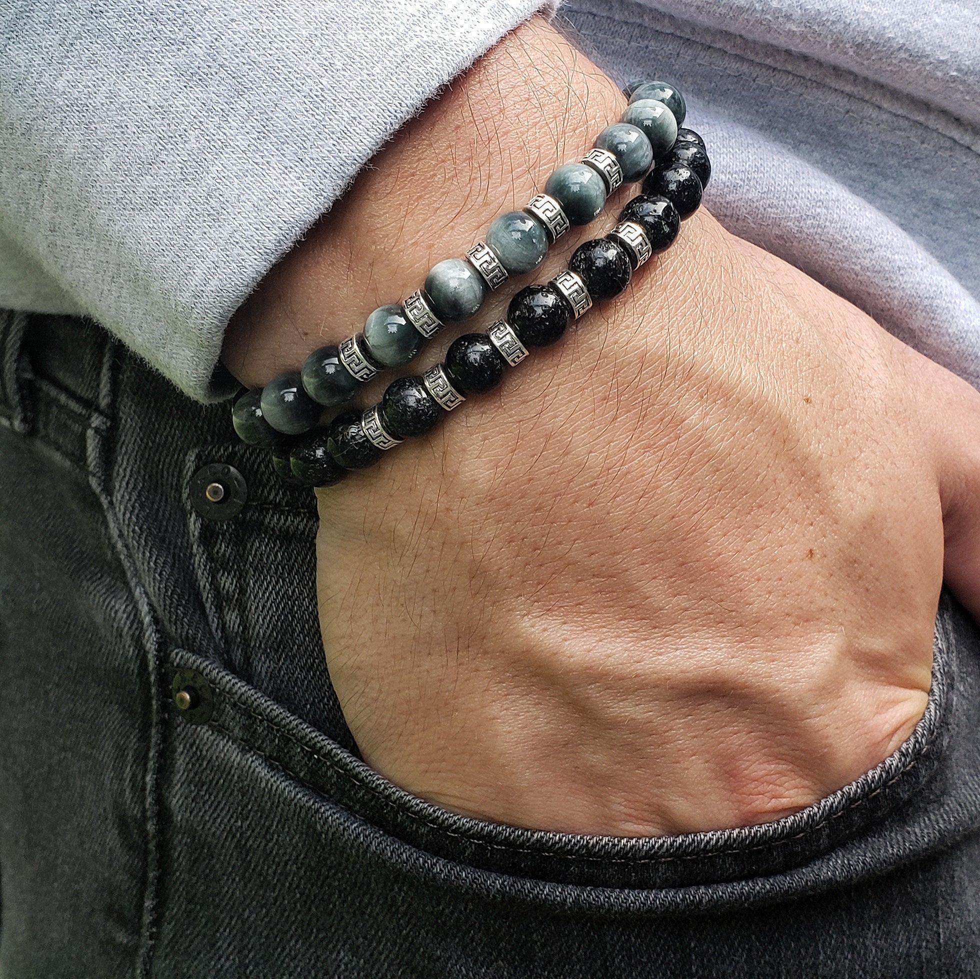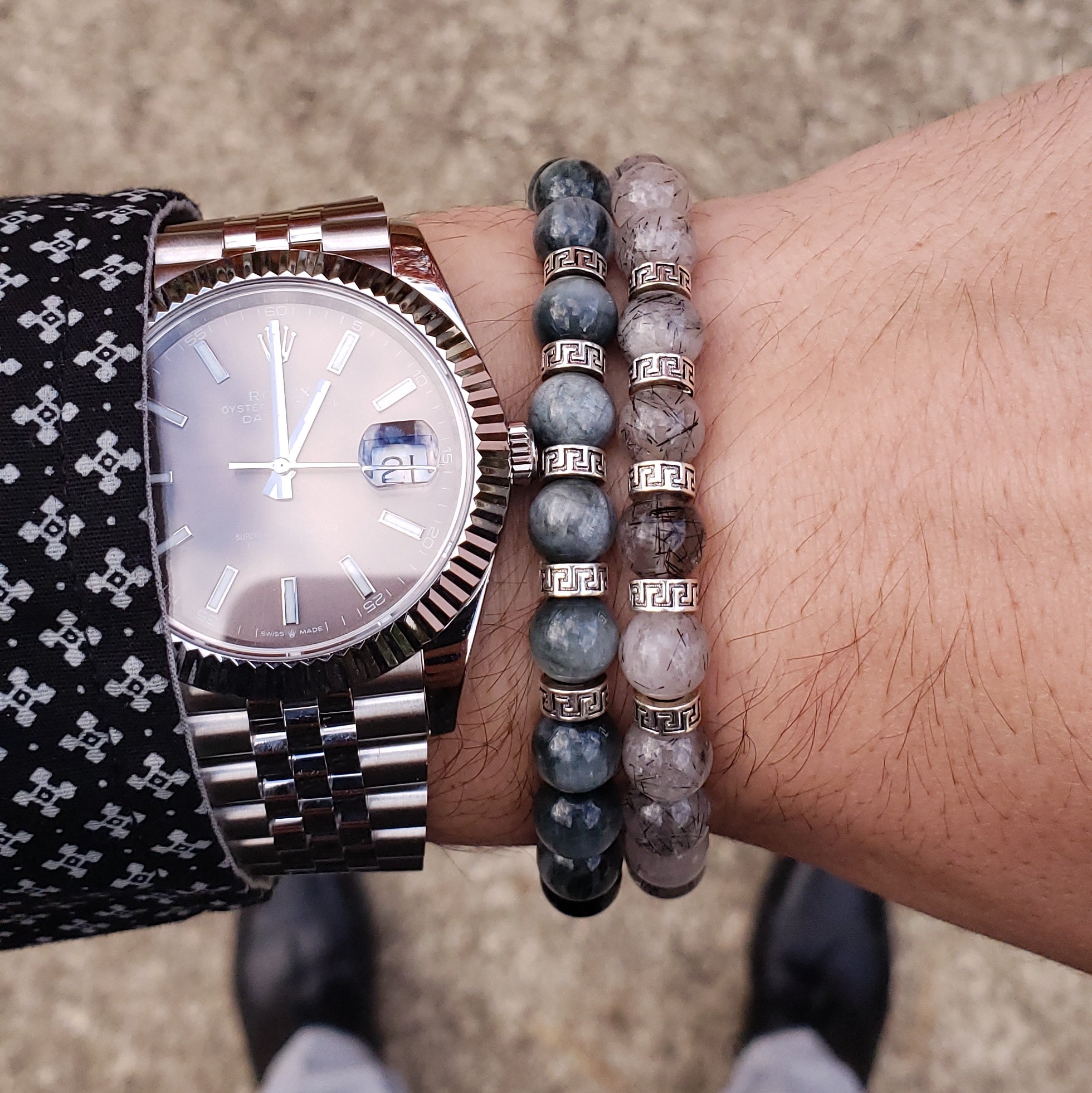 Our Penta Eagle Eye bracelet is completely handmade with natural 8mm Eagle Eye gemstones. This piece derives its name from the 5 distinct Greek spacers on the front of the bracelet. Each spacer is made of pure 925 sterling silver. Our signature Gemvius 24k gold vermeil spacer is added near the back as a mark of where the piece was created.