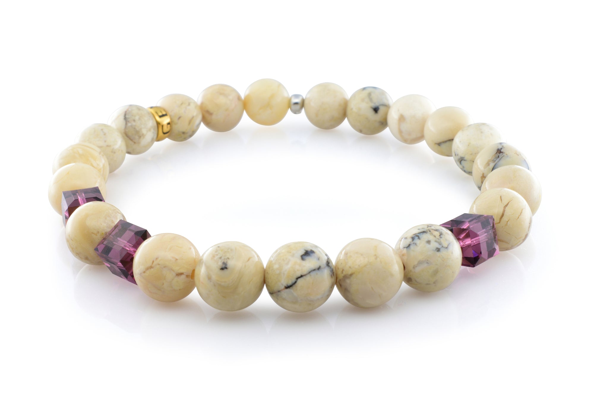 Our February Amethyst African Opal bracelet is completely handmade with natural 8mm African Opal gemstones. This piece is designed around three stunning 6mm Swarovski amethyst crystal cubes. Each crystal cut and polished to perfection. Our signature Gemvius 24k gold vermeil spacer is added near the back as a mark of where the piece was created.