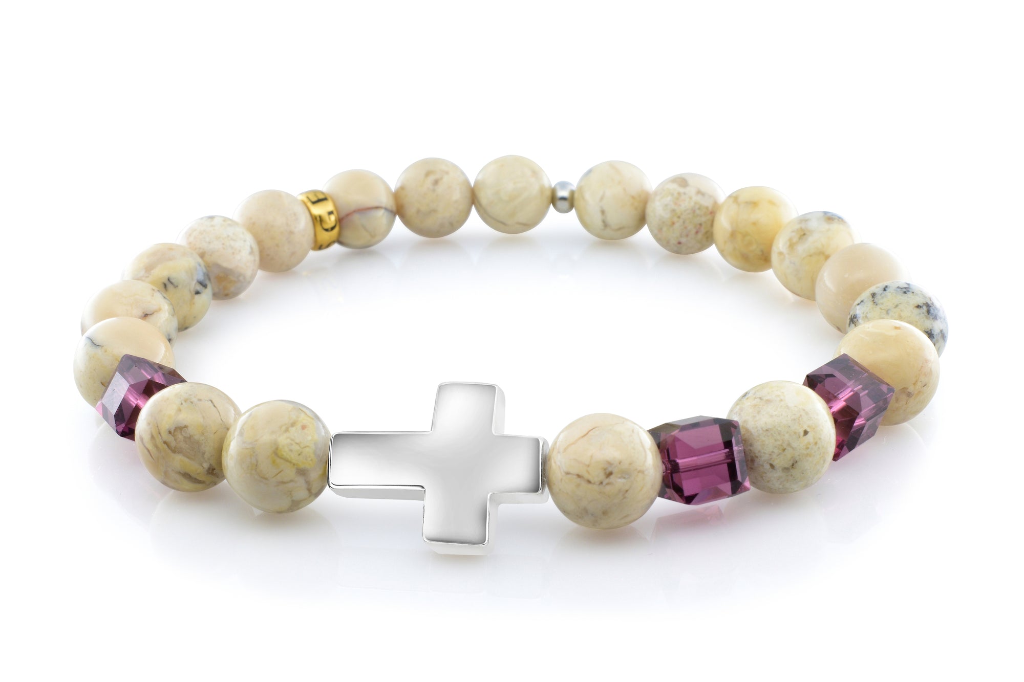 Our February Amethyst African Opal bracelet is completely handmade with natural 8mm African Opal gemstones. This piece is designed around three stunning 6mm Swarovski amethyst crystal cubes and a premium 925 sterling silver cross. Our signature Gemvius 24k gold vermeil spacer is added near the back as a mark of where the piece was created.