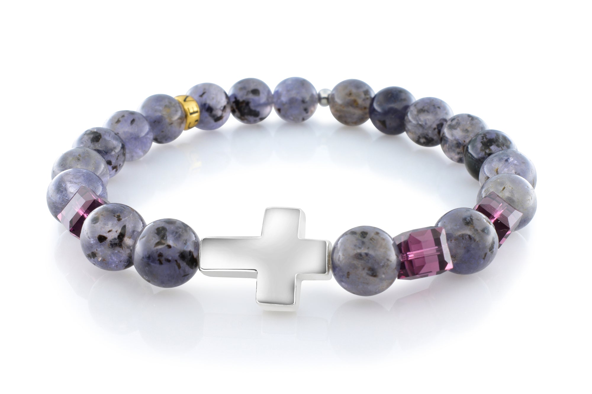 Our February Amethyst Iolite bracelet is completely handmade with natural 8mm Iolite gemstones. This piece is designed around three stunning 6mm Swarovski amethyst crystal cubes and a premium 925 sterling silver cross. Our signature Gemvius 24k gold vermeil spacer is added near the back as a mark of where the piece was created.