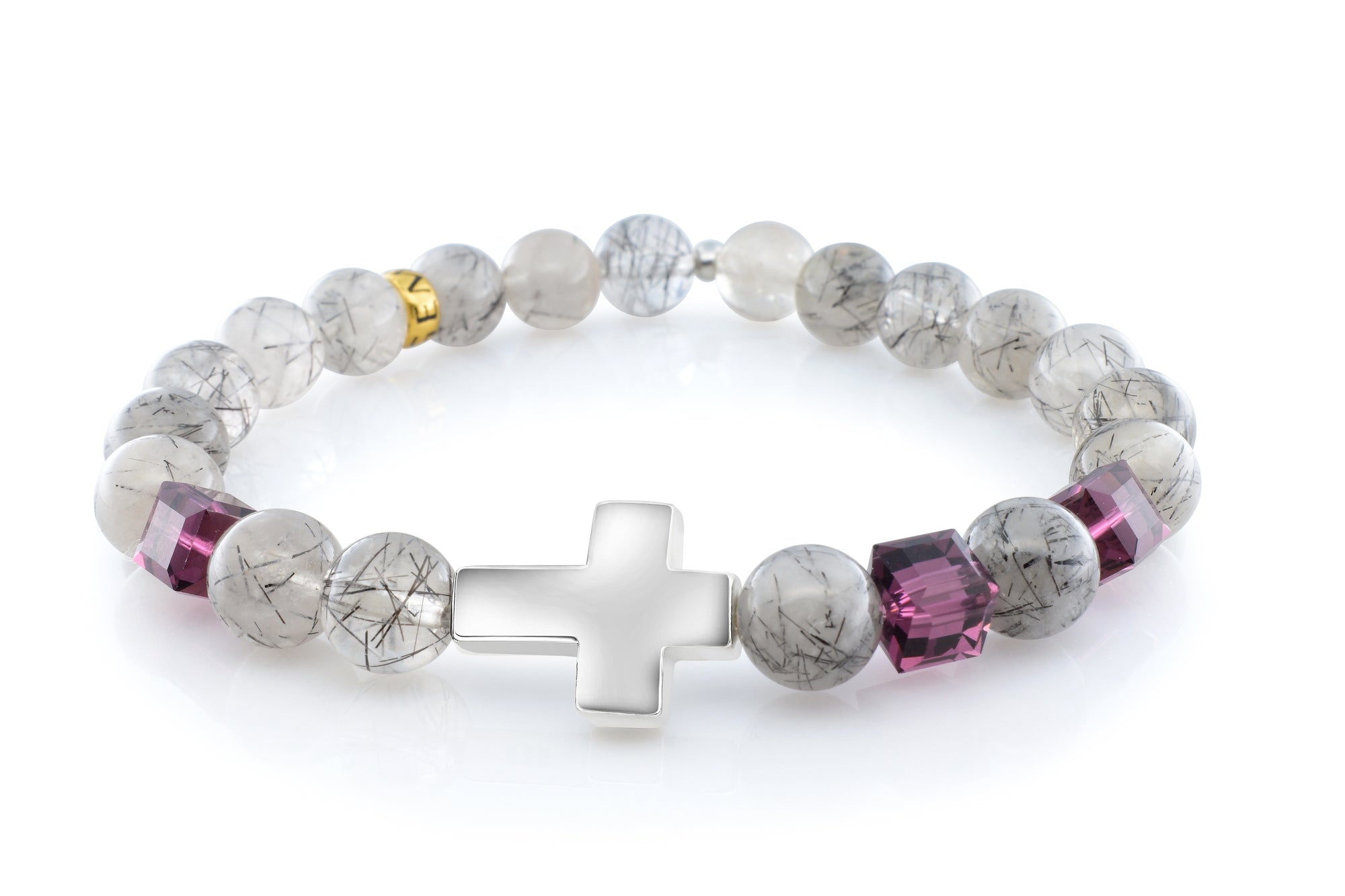 Our February Amethyst Cross Tourmalinated Quartz bracelet is completely handmade with natural 8mm Tourmalinated Quartz gemstones. This piece is designed around three stunning 6mm Swarovski amethyst crystal cubes and a premium 925 sterling silver cross. Our signature Gemvius 24k gold vermeil spacer is added near the back as a mark of where the piece was created.