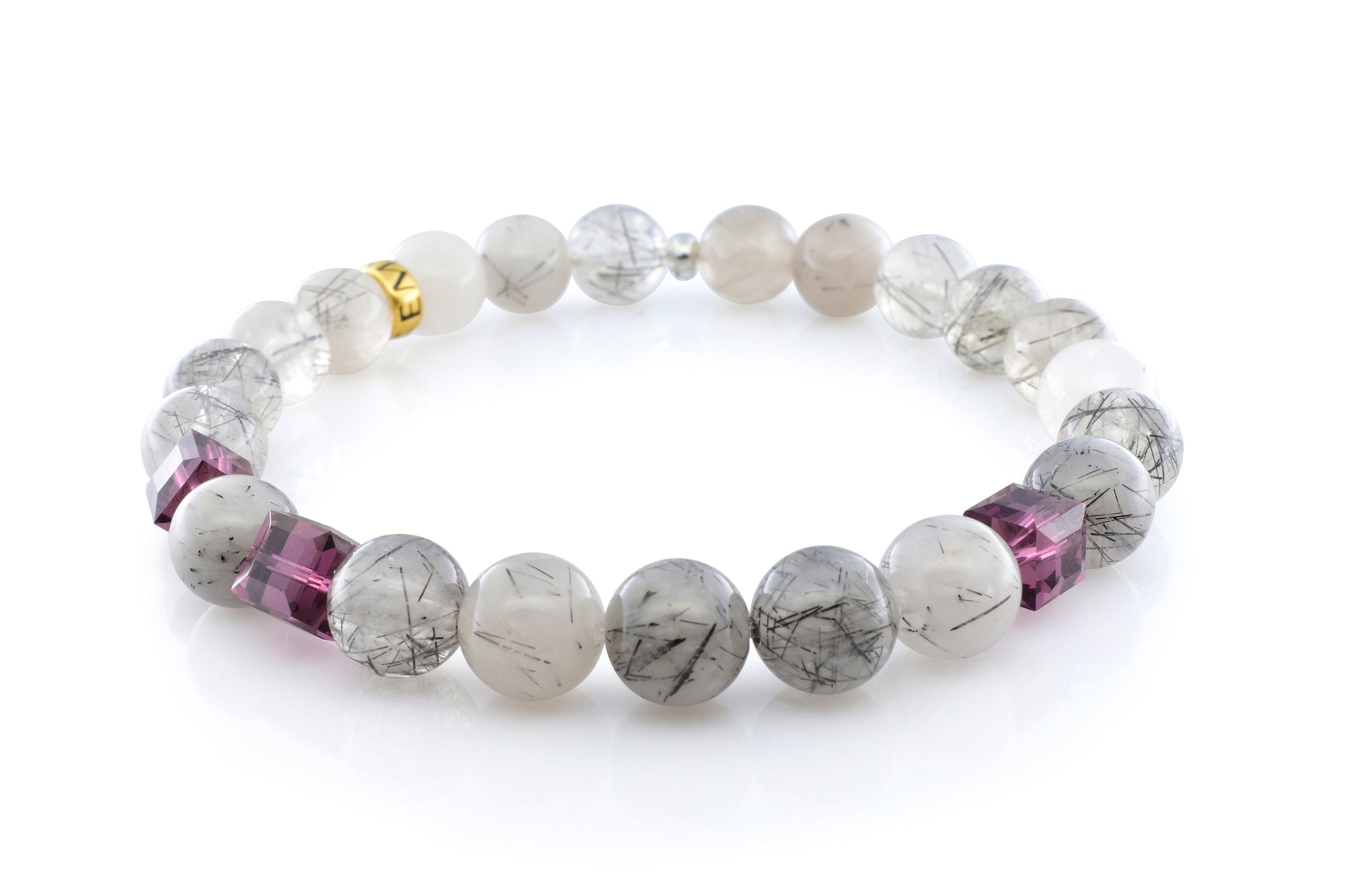 Our February Amethyst Tourmalinated Quartz bracelet is completely handmade with natural 8mm Tourmalinated Quartz gemstones. This piece is designed around three stunning 6mm Swarovski amethyst crystal cubes. Each crystal cut and polished to perfection. Our signature Gemvius 24k gold vermeil spacer is added near the back as a mark of where the piece was created.