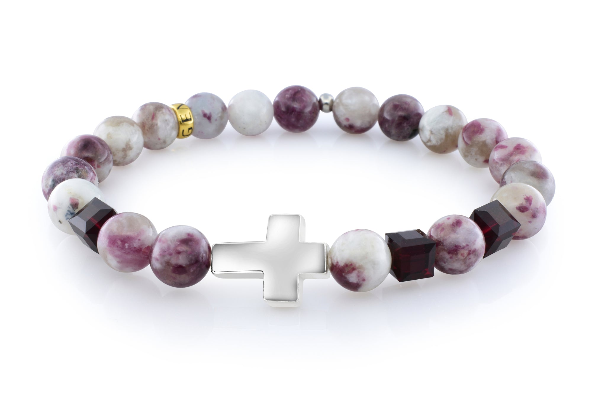 Our January Garnet Madagascar Eudialyte bracelet is completely handmade with natural 8mm Madagascar Eudialyte gemstones. This piece is designed around three stunning 6mm Swarovski garnet crystal cubes and a premium 925 sterling silver cross. Our signature Gemvius 24k gold vermeil spacer is added near the back as a mark of where the piece was created.
