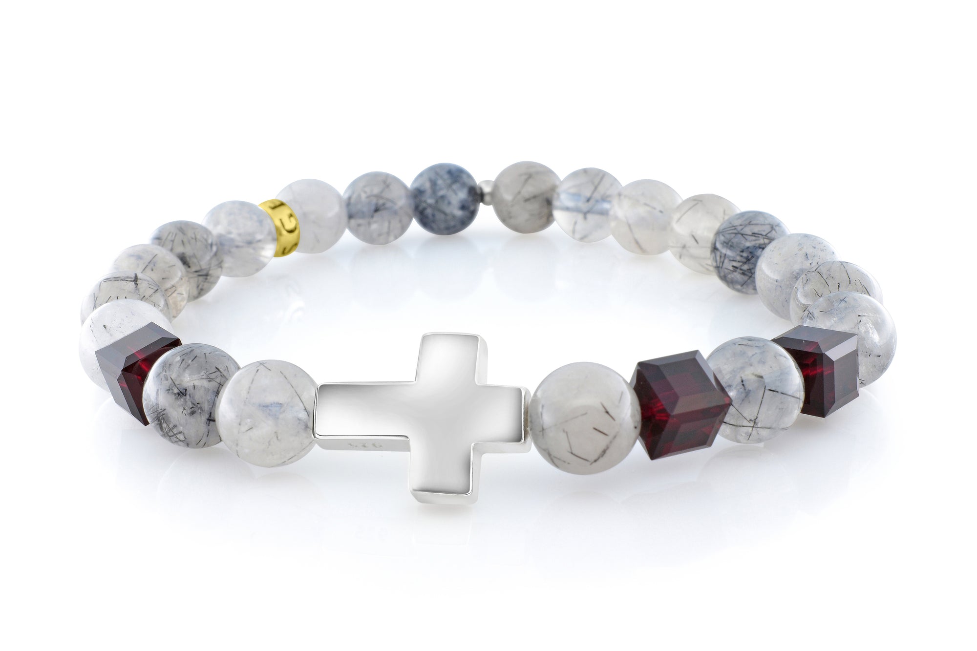 Our January Garnet Cross Tourmalinated Quartz bracelet is completely handmade with natural 8mm Tourmalinated Quartz gemstones. This piece is designed around three stunning 6mm Swarovski garnet crystal cubes and a premium 925 sterling silver cross. Our signature Gemvius 24k gold vermeil spacer is added near the back as a mark of where the piece was created.