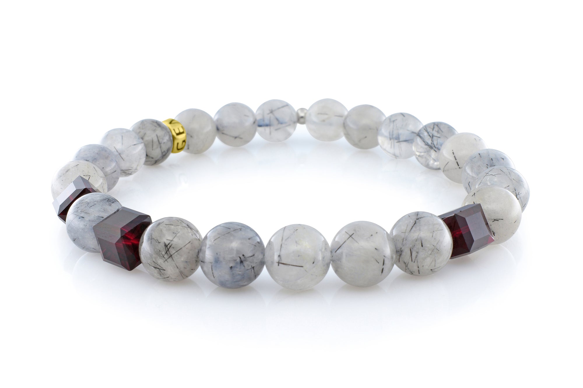 Our January Garnet Tourmalinated Quartz bracelet is completely handmade with natural 8mm Tourmalinated Quartz gemstones. This piece is designed around three stunning 6mm Swarovski garnet crystal cubes. Each crystal cut and polished to perfection. Our signature Gemvius 24k gold vermeil spacer is added near the back as a mark of where the piece was created.