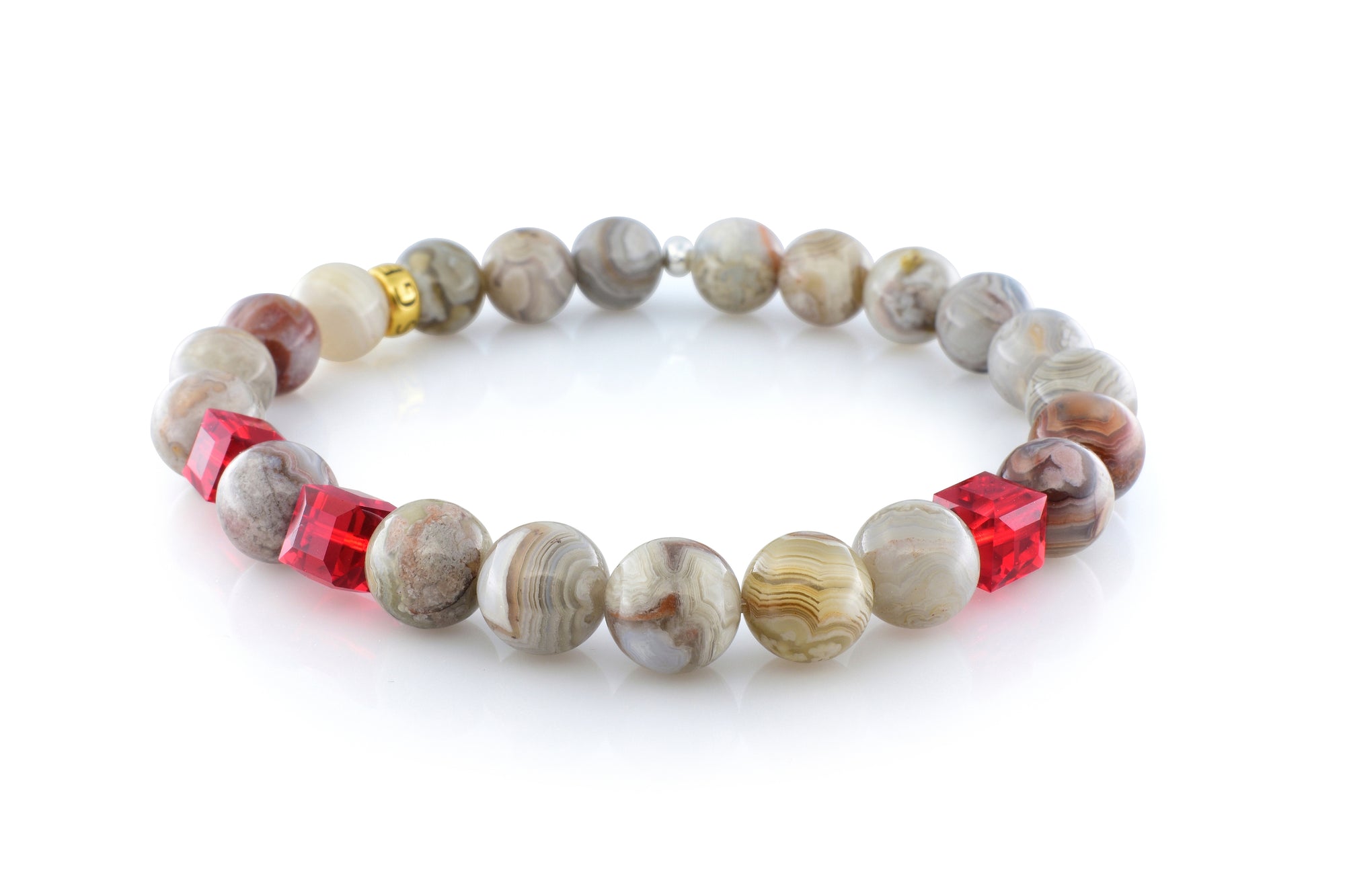 Our July Ruby Mexican Agate bracelet is completely handmade with natural 8mm Mexican Agate gemstones. This piece is designed around three stunning 6mm Swarovski ruby crystal cubes. Each crystal cut and polished to perfection. Our signature Gemvius 24k gold vermeil spacer is added near the back as a mark of where the piece was created.