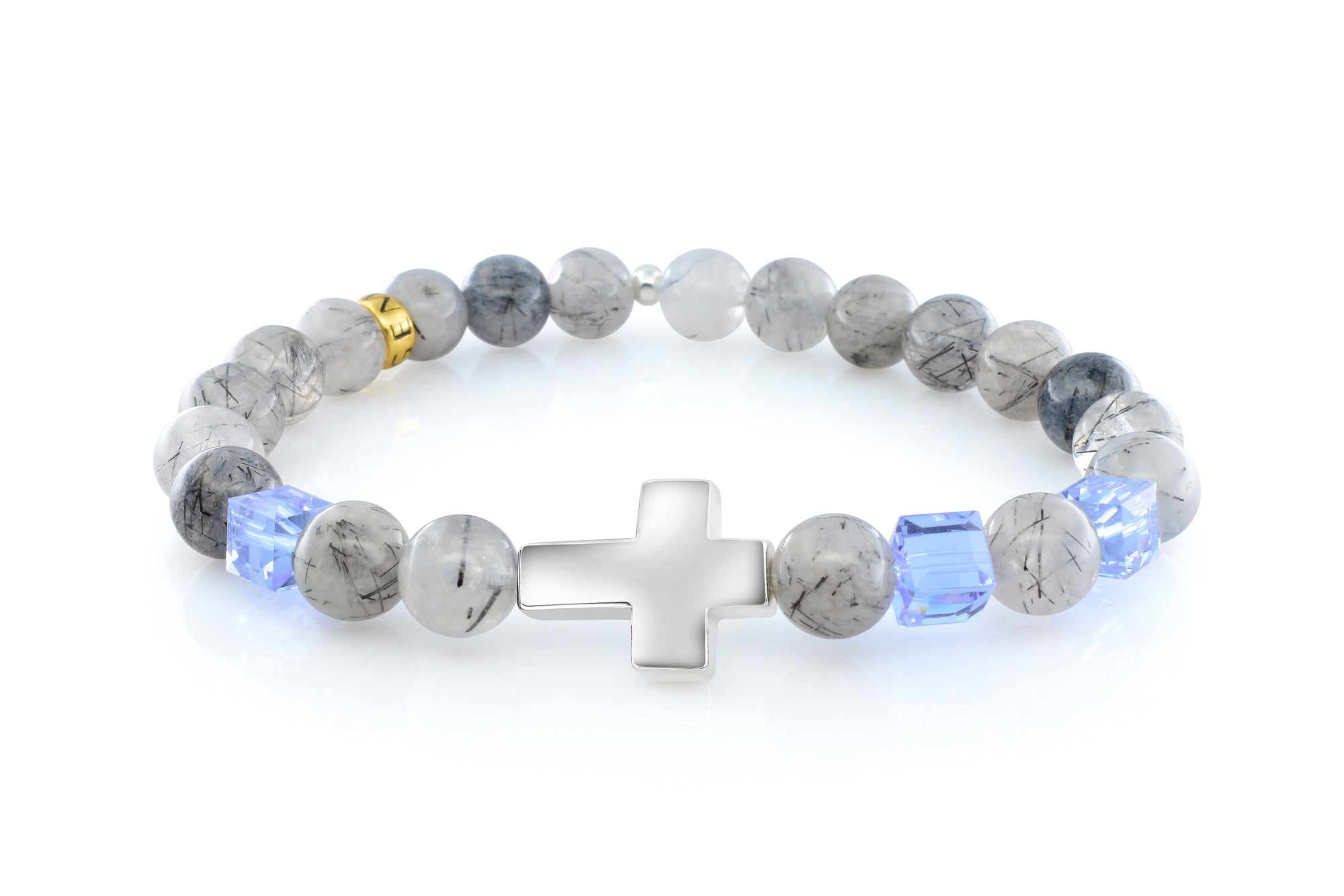 Our June Alexandrite Cross Tourmalinated Quartz bracelet is completely handmade with natural 8mm Tourmalinated Quartz gemstones. This piece is designed around three stunning 6mm Swarovski alexandrite crystal cubes and a premium 925 sterling silver cross. Our signature Gemvius 24k gold vermeil spacer is added near the back as a mark of where the piece was created.