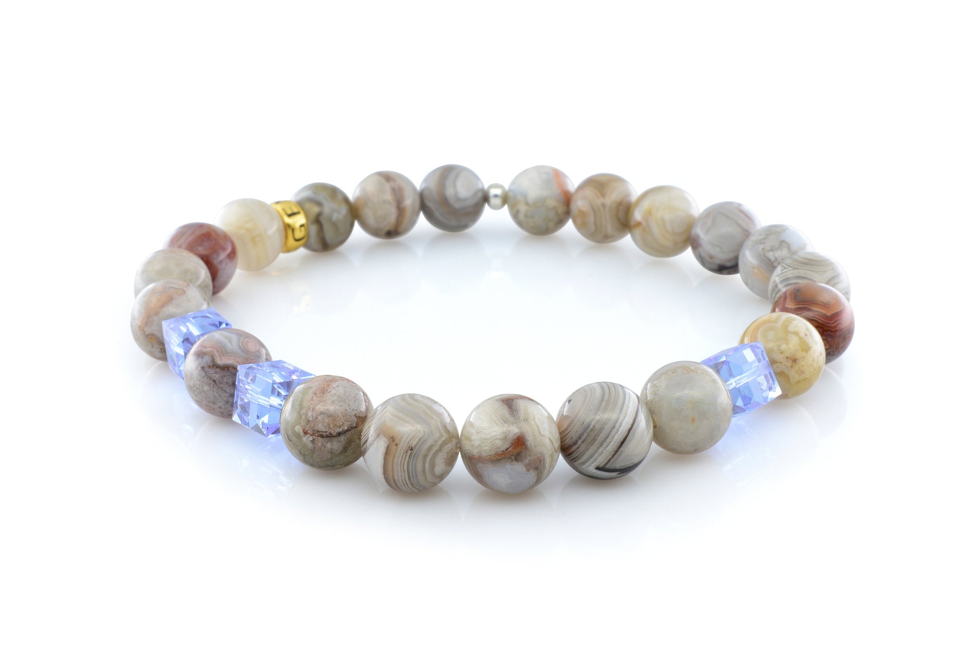 Our June Alexandrite Mexican Agate bracelet is completely handmade with natural 8mm Mexican Agate gemstones. This piece is designed around three stunning 6mm Swarovski alexandrite crystal cubes. Each crystal cut and polished to perfection. Our signature Gemvius 24k gold vermeil spacer is added near the back as a mark of where the piece was created.