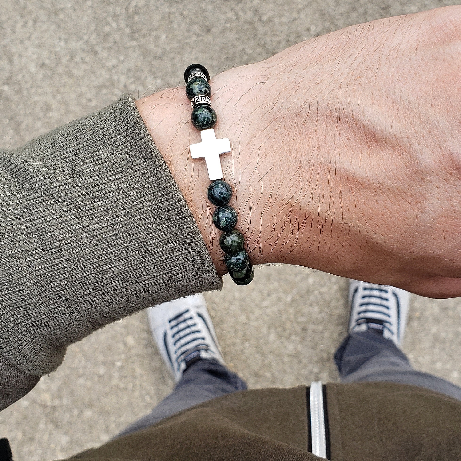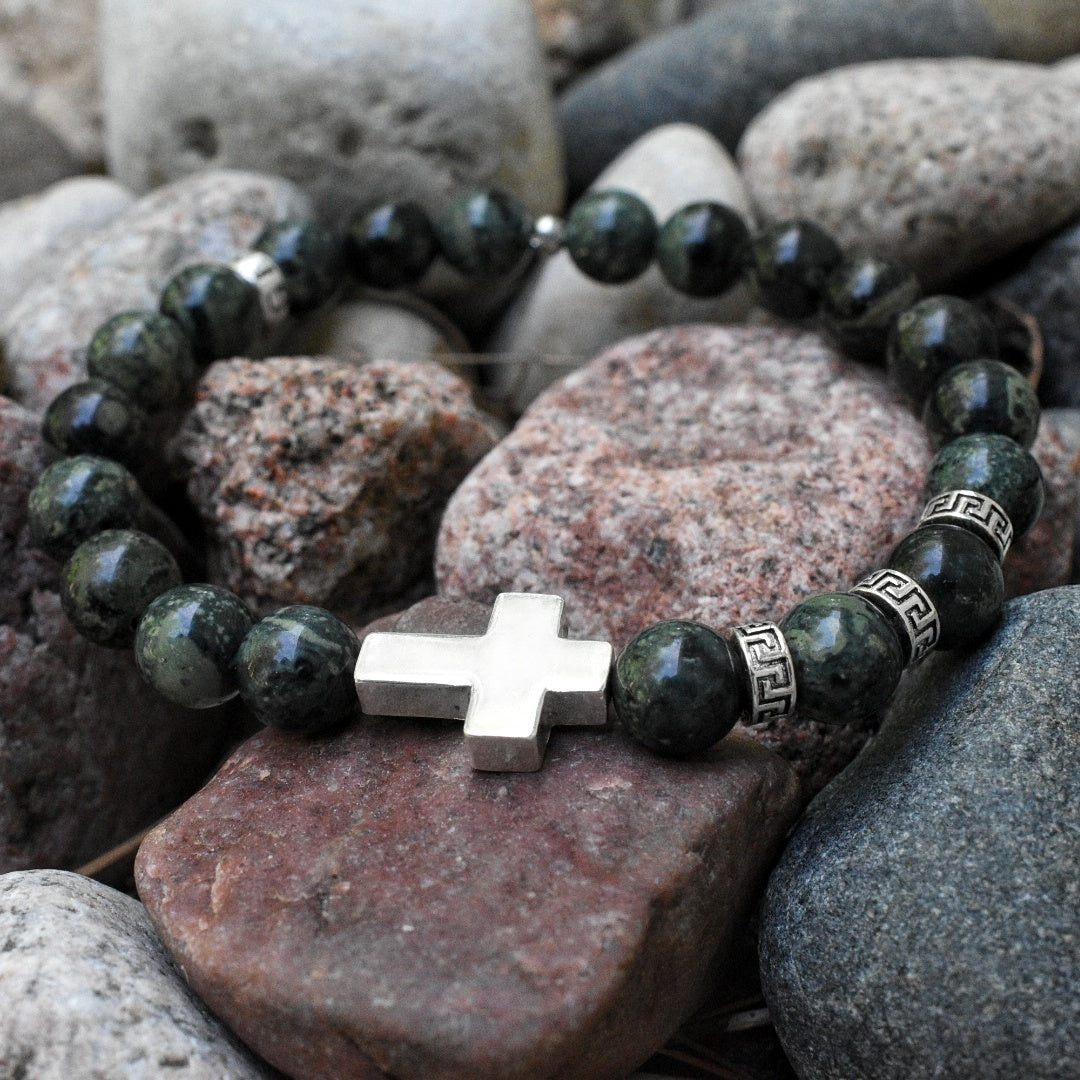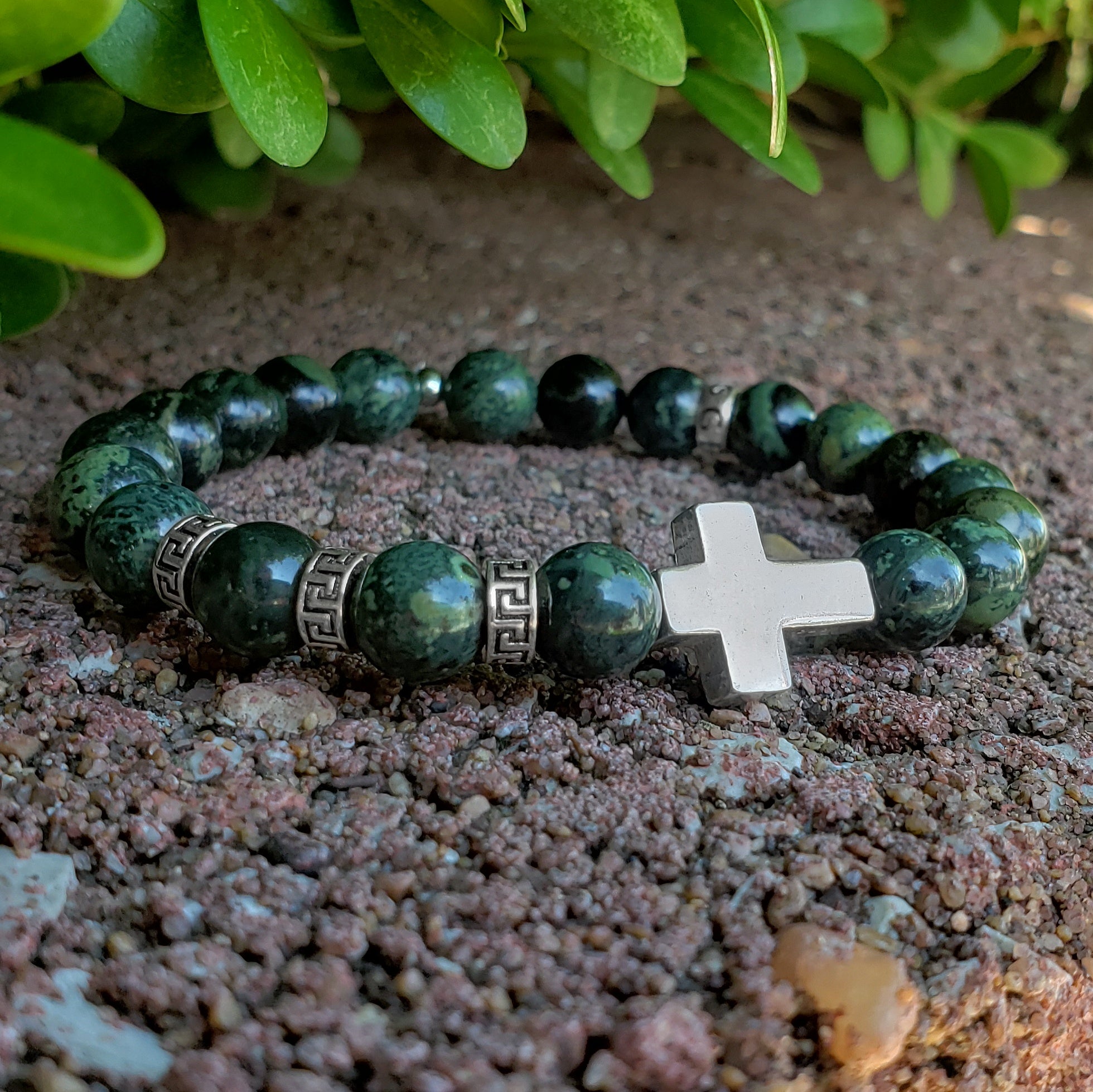 Our Premium Cross Kambaba Rhyolite bracelet is completely handmade with natural 8mm Kambaba Rhyolite gemstones. The focal point of this piece is the premium 925 sterling silver cross which has been accented by three pure 925 sterling silver greek spacers giving the bracelet an exquisite touch. Our signature Gemvius 24k gold vermeil spacer is added near the back as an identifier of where the piece was created.