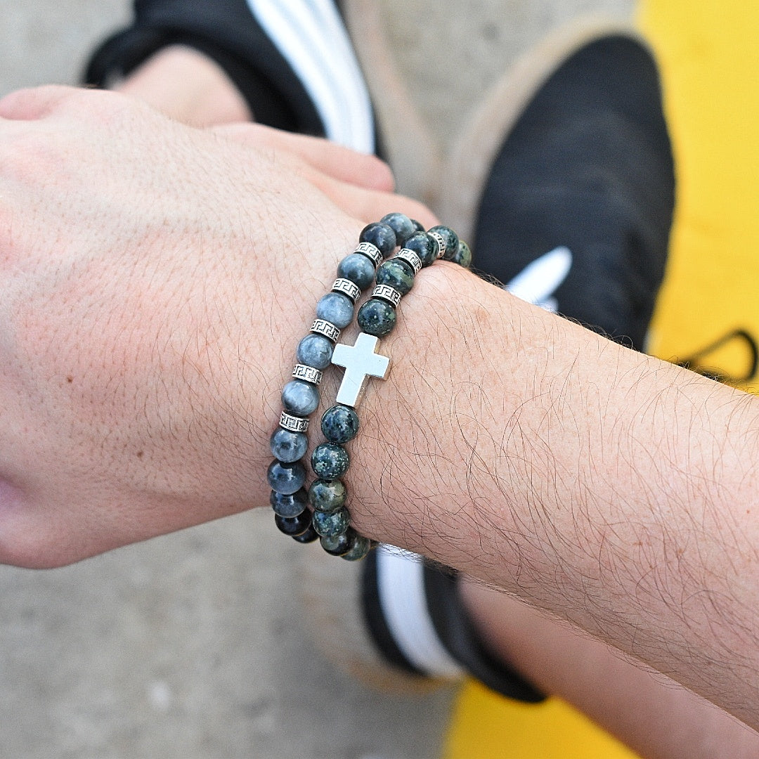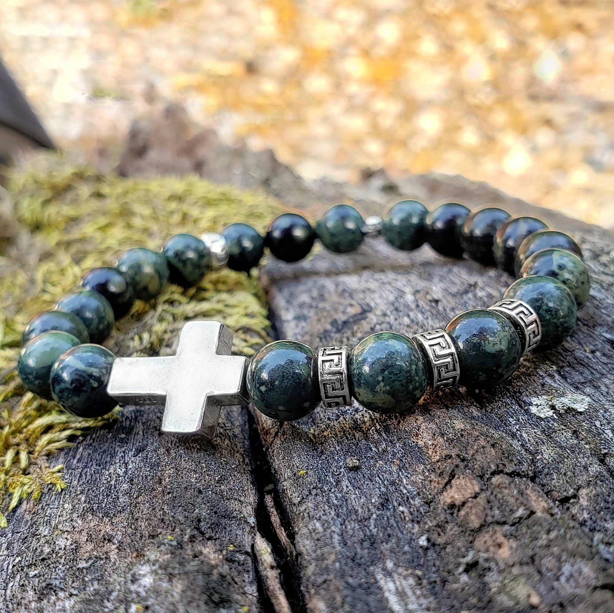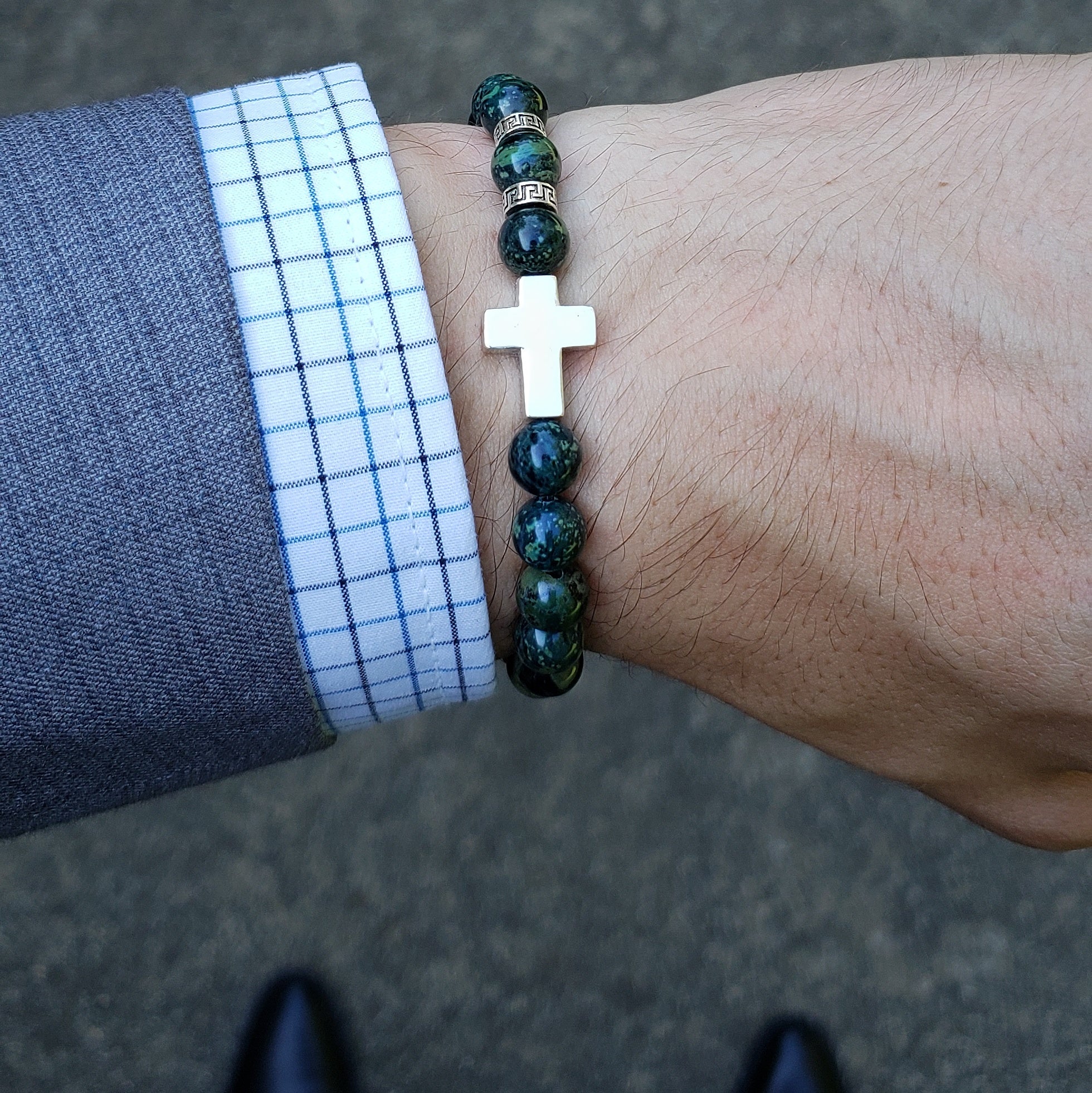 Our Premium Cross Kambaba Rhyolite bracelet is completely handmade with natural 8mm Kambaba Rhyolite gemstones. The focal point of this piece is the premium 925 sterling silver cross which has been accented by three pure 925 sterling silver greek spacers giving the bracelet an exquisite touch. Our signature Gemvius 24k gold vermeil spacer is added near the back as an identifier of where the piece was created.
