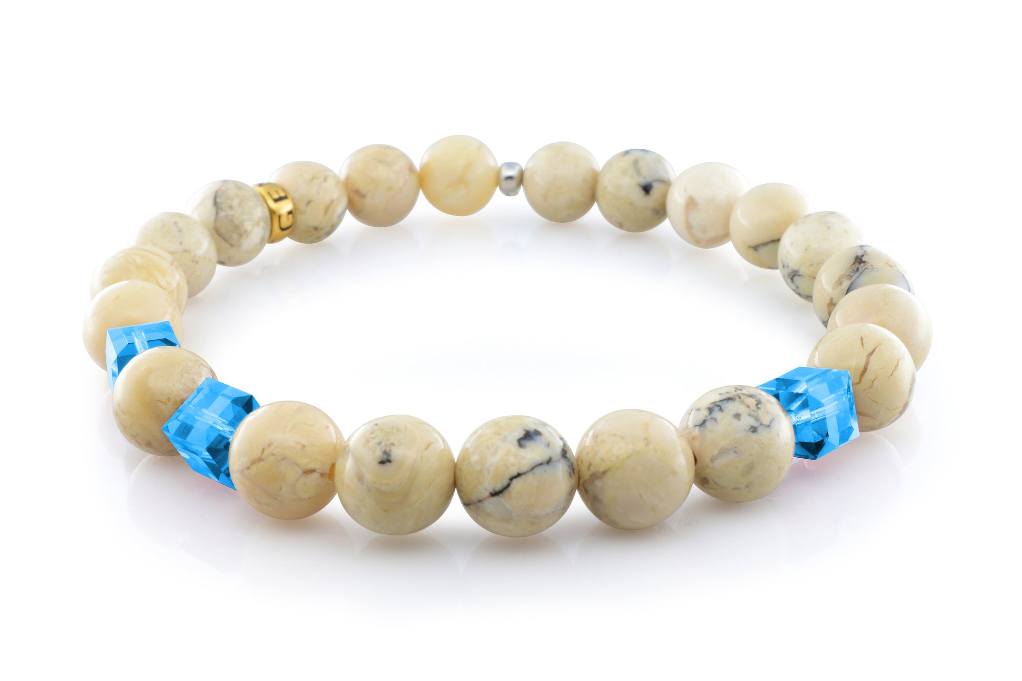 Our March Aquamarine African Opal bracelet is completely handmade with natural 8mm African Opal gemstones. This piece is designed around three stunning 6mm Swarovski aquamarine crystal cubes. Each crystal cut and polished to perfection. Our signature Gemvius 24k gold vermeil spacer is added near the back as a mark of where the piece was created.