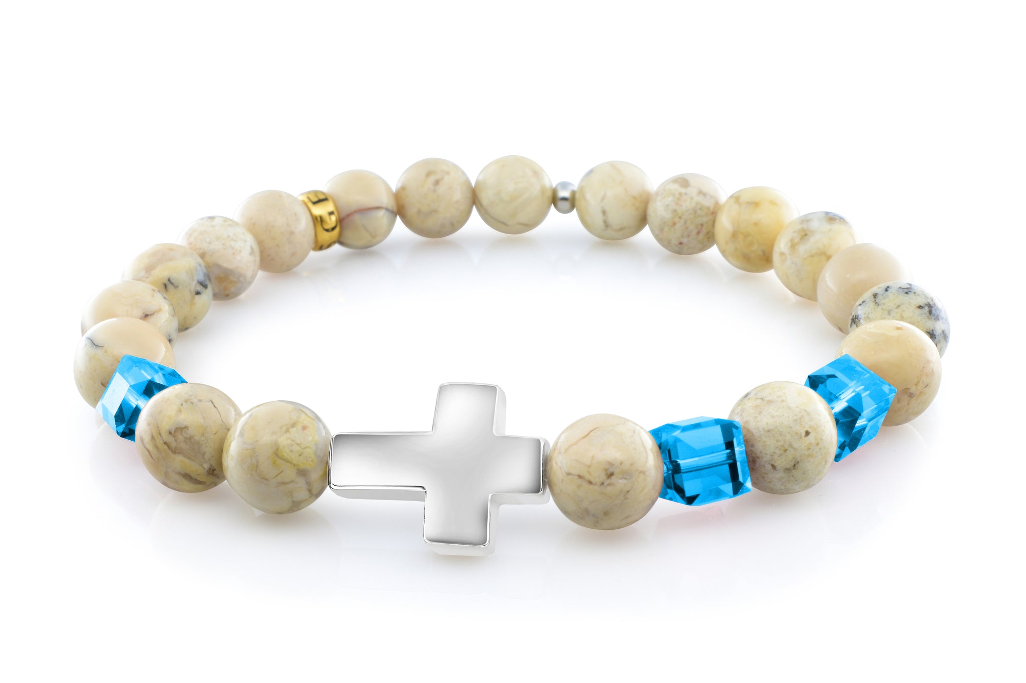 Our March Aquamarine African Opal bracelet is completely handmade with natural 8mm African Opal gemstones. This piece is designed around three stunning 6mm Swarovski aquarmarine crystal cubes and a premium 925 sterling silver cross. Our signature Gemvius 24k gold vermeil spacer is added near the back as a mark of where the piece was created.