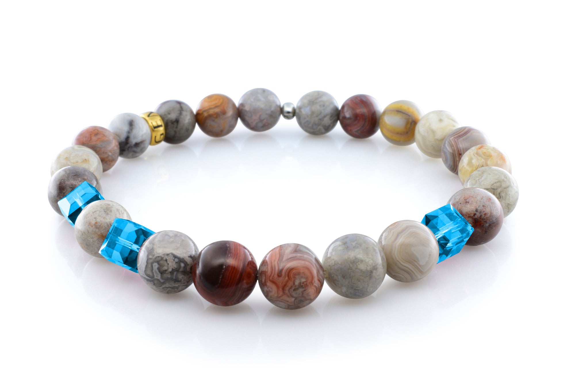 Our March Aquamarine Mexican Agate bracelet is completely handmade with natural 8mm Mexican Agate gemstones. This piece is designed around three stunning 6mm Swarovski aquamarine crystal cubes. Each crystal cut and polished to perfection. Our signature Gemvius 24k gold vermeil spacer is added near the back as a mark of where the piece was created.