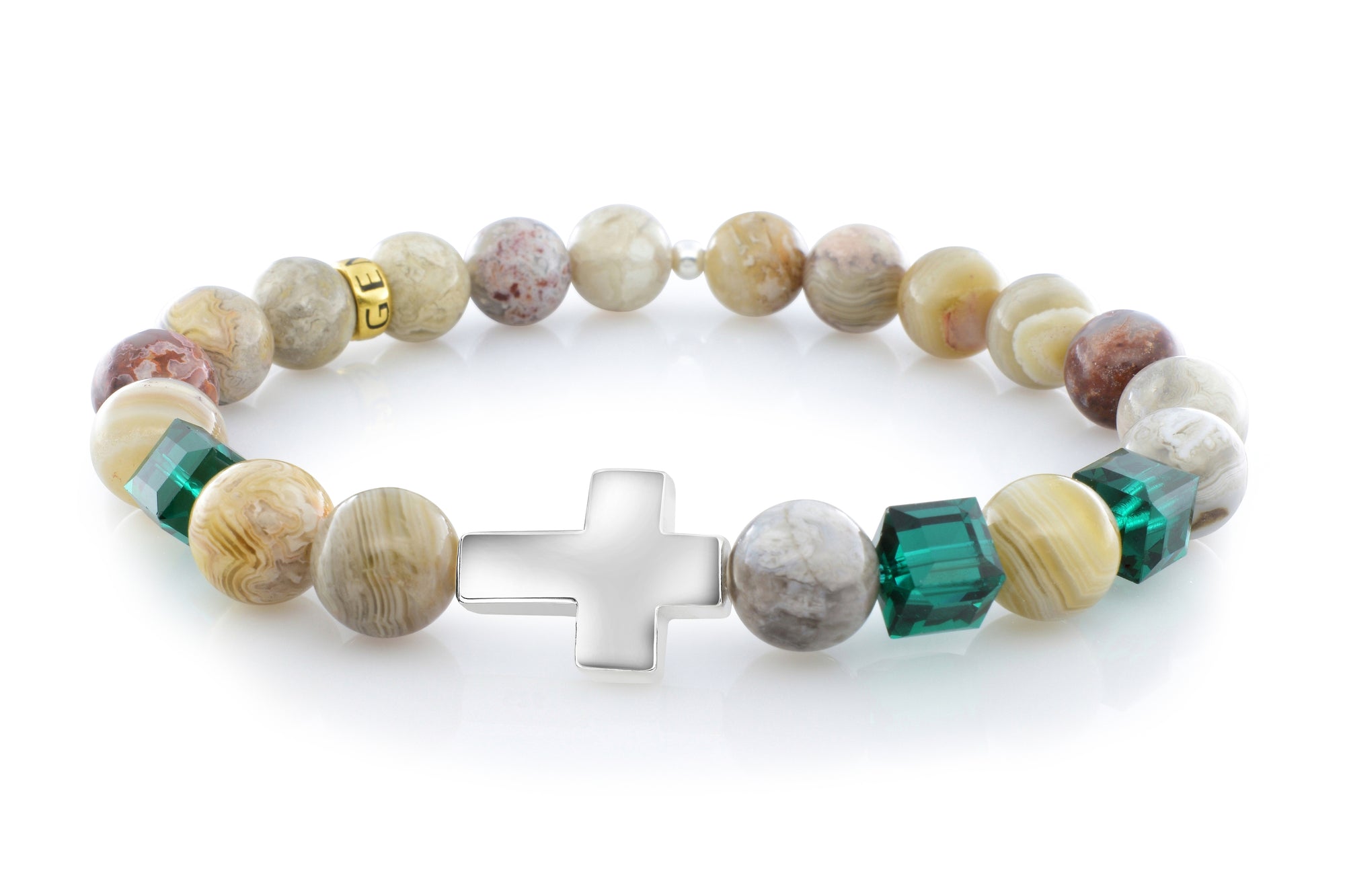 Our May Emerald Mexican Agate bracelet is completely handmade with natural 8mm Mexican Agate gemstones. This piece is designed around three stunning 6mm Swarovski emerald crystal cubes and a premium 925 sterling silver cross. Our signature Gemvius 24k gold vermeil spacer is added near the back as a mark of where the piece was created.