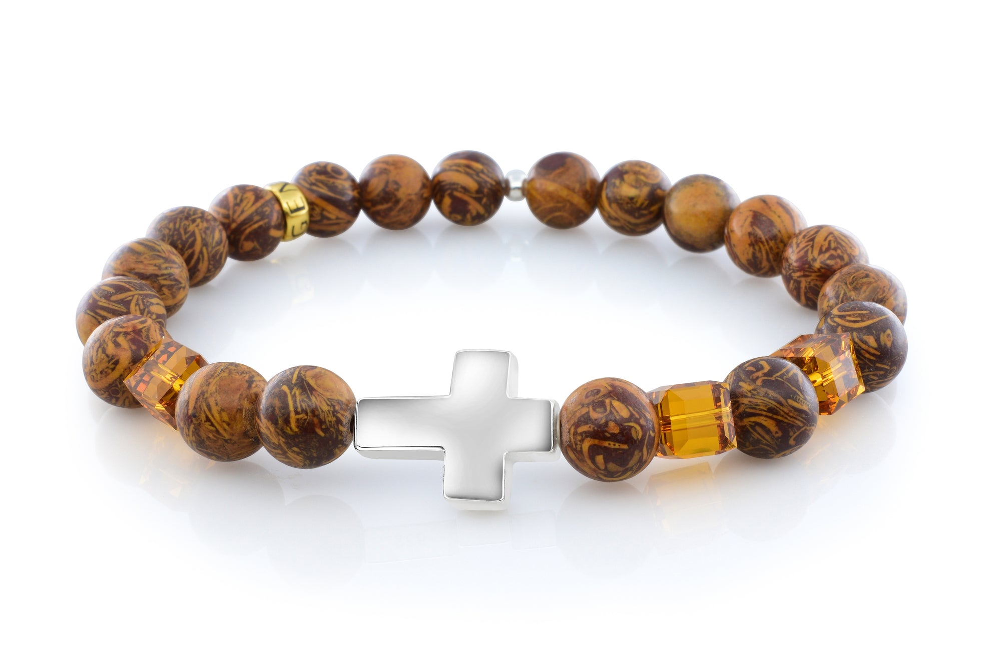 Our November Topaz Cross Calligraphy bracelet is completely handmade with natural 8mm Calligraphy gemstones. This piece is designed around three stunning 6mm Swarovski topaz crystal cubes and a premium 925 sterling silver cross. Our signature Gemvius 24k gold vermeil spacer is added near the back as a mark of where the piece was created.