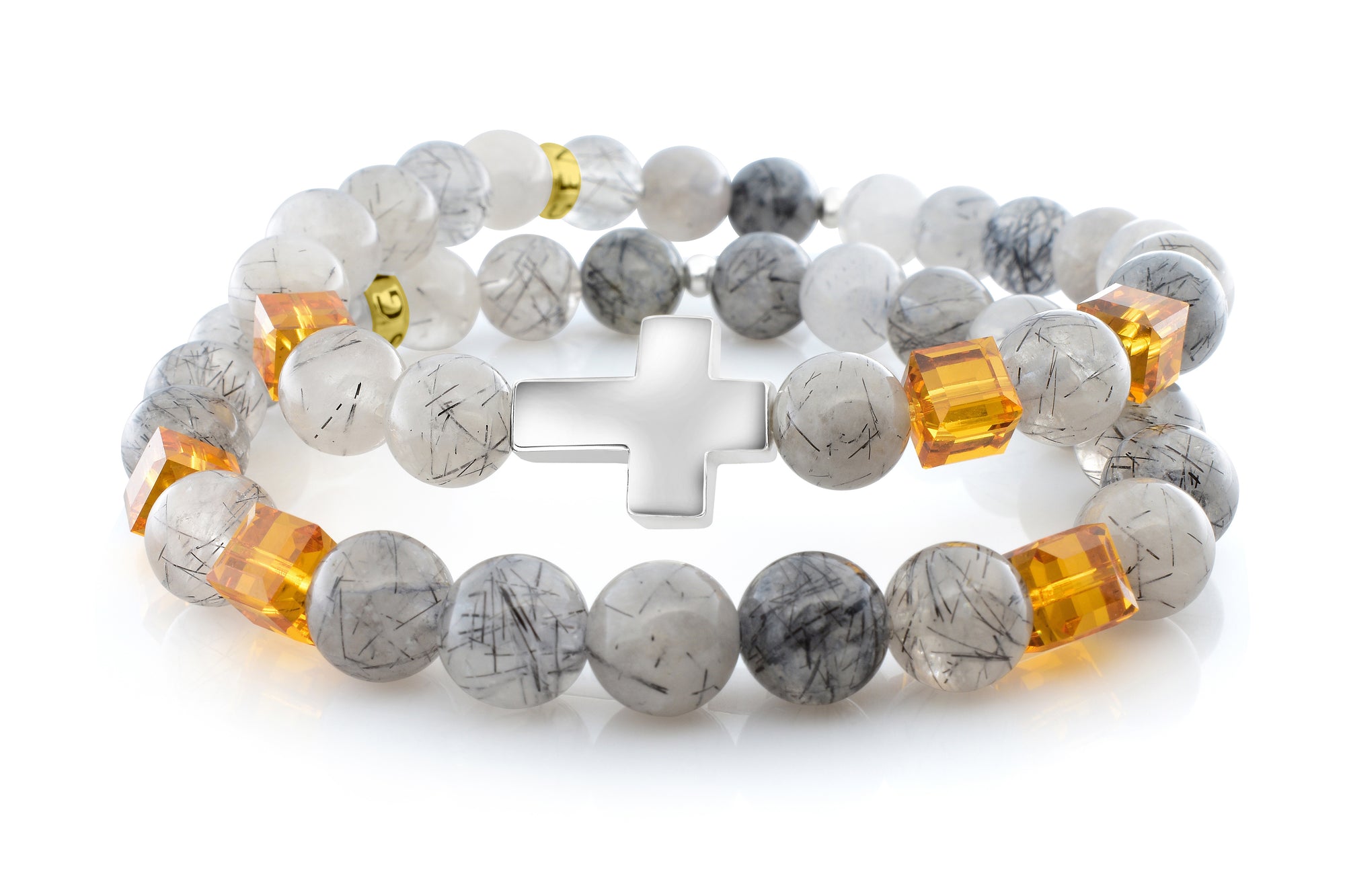 Our November Topaz Cross Tourmalinated Quartz bracelet is completely handmade with natural 8mm Tourmalinated Quartz gemstones. This piece is designed around three stunning 6mm Swarovski topaz crystal cubes and a premium 925 sterling silver cross. Our signature Gemvius 24k gold vermeil spacer is added near the back as a mark of where the piece was created.