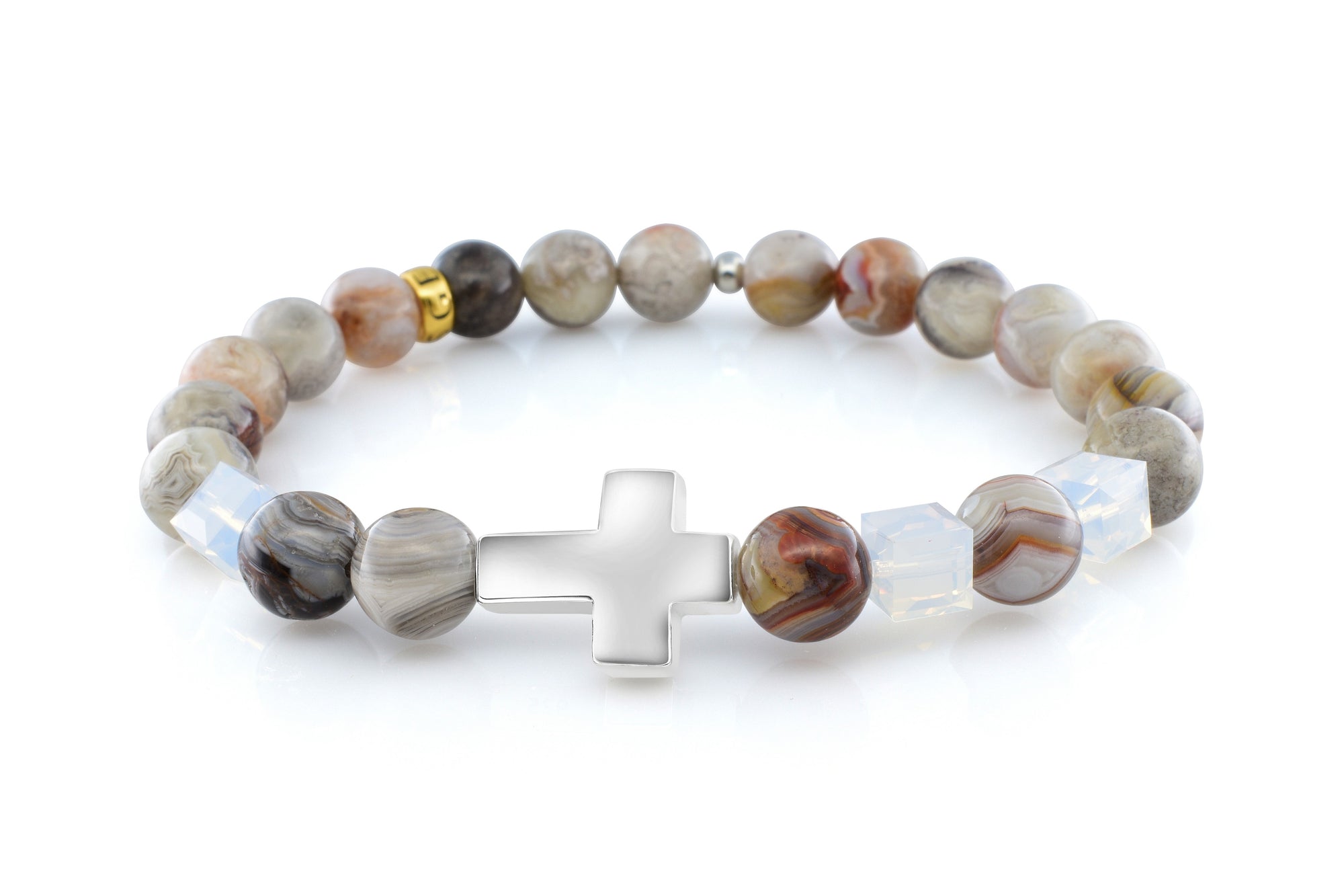 Our October Opal Mexican Agate bracelet is completely handmade with natural 8mm Mexican Agate gemstones. This piece is designed around three stunning 6mm Swarovski opal crystal cubes and a premium 925 sterling silver cross. Our signature Gemvius 24k gold vermeil spacer is added near the back as a mark of where the piece was created.