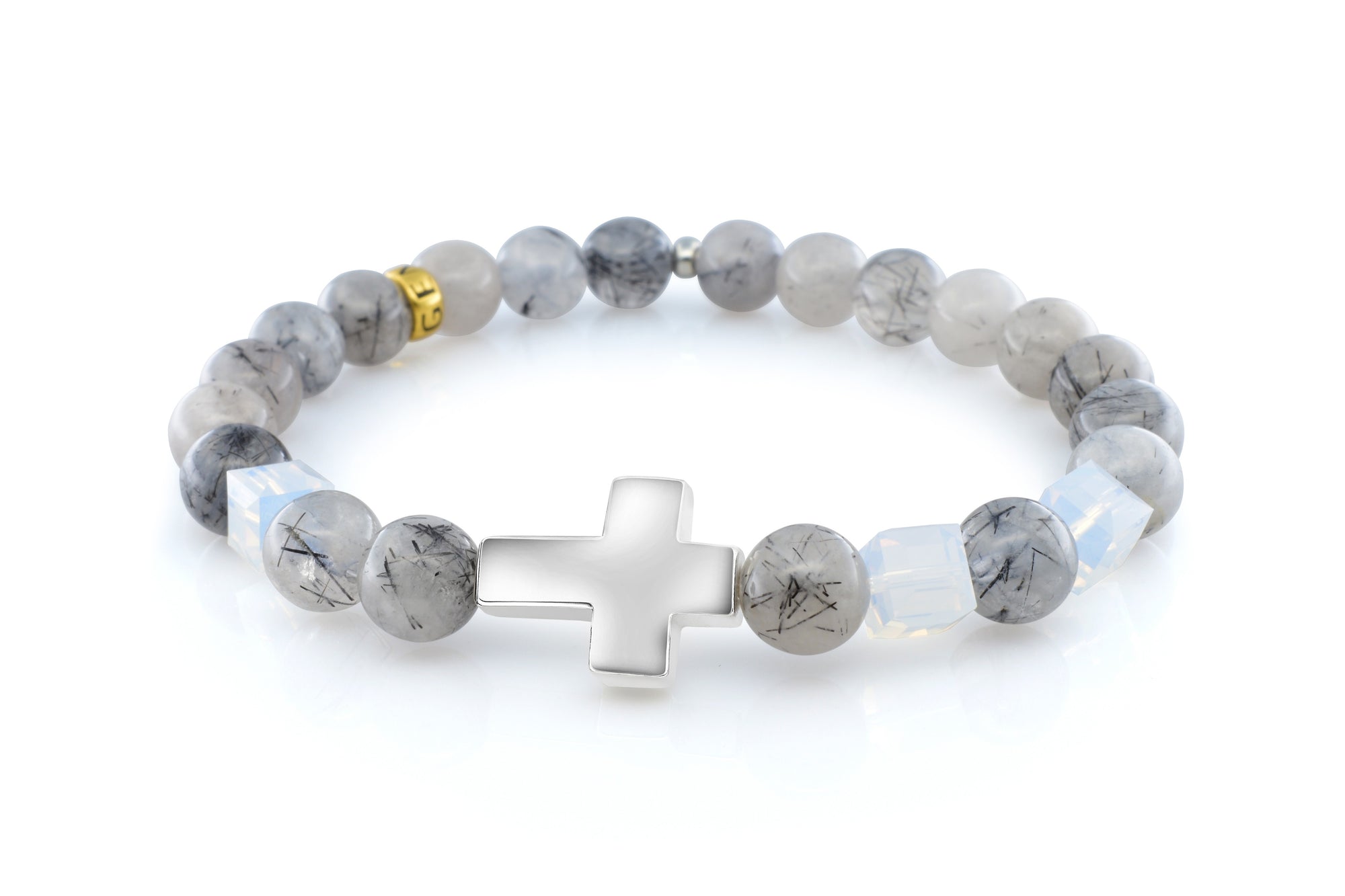 Our October Opal Cross Tourmalinated Quartz bracelet is completely handmade with natural 8mm Tourmalinated Quartz gemstones. This piece is designed around three stunning 6mm Swarovski opal crystal cubes and a premium 925 sterling silver cross. Our signature Gemvius 24k gold vermeil spacer is added near the back as a mark of where the piece was created.