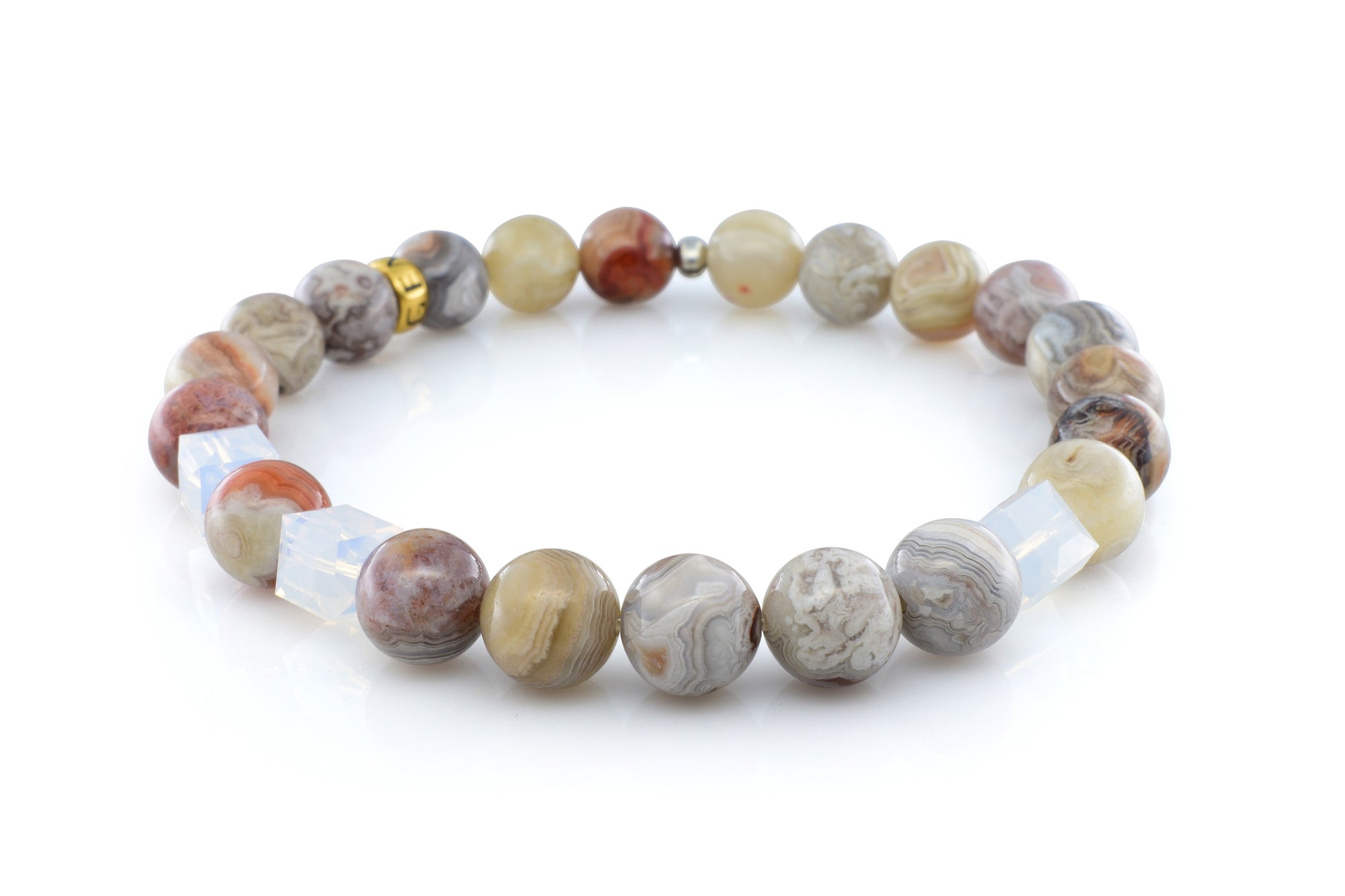 Our October Opal Mexican Agate bracelet is completely handmade with natural 8mm Mexican Agate gemstones. This piece is designed around three stunning 6mm Swarovski opal crystal cubes. Each crystal cut and polished to perfection. Our signature Gemvius 24k gold vermeil spacer is added near the back as a mark of where the piece was created.