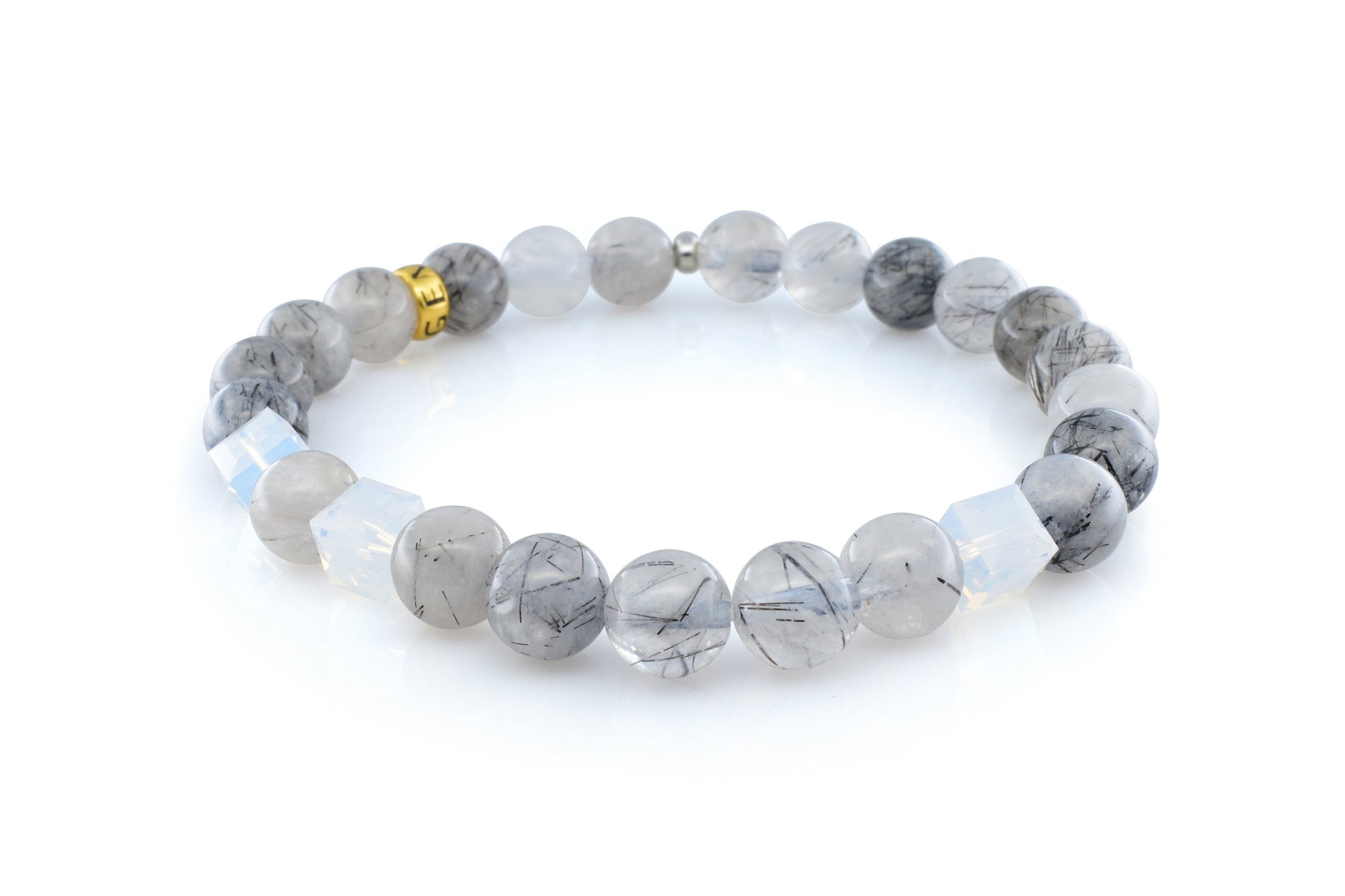 Our October Opal Tourmalinated Quartz bracelet is completely handmade with natural 8mm Tourmalinated Quartz gemstones. This piece is designed around three stunning 6mm Swarovski opal crystal cubes. Each crystal cut and polished to perfection. Our signature Gemvius 24k gold vermeil spacer is added near the back as a mark of where the piece was created.