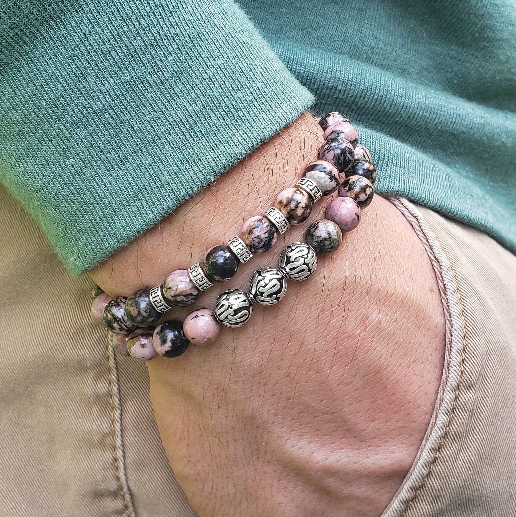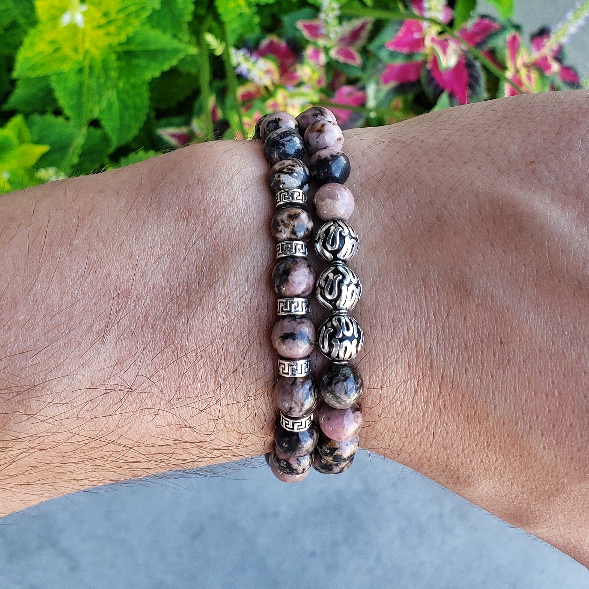 Our Penta Rhodonite bracelet is completely handmade with natural 8mm Rhodonite gemstones. This piece derives its name from the 5 distinct Greek spacers on the front of the bracelet. Each spacer is made of pure 925 sterling silver. Our signature Gemvius 24k gold vermeil spacer is added near the back as a mark of where the piece was created.