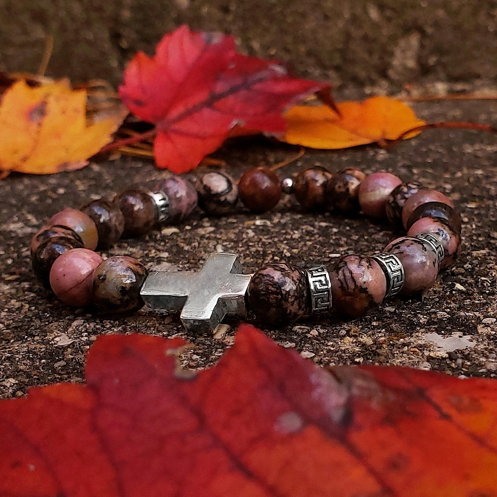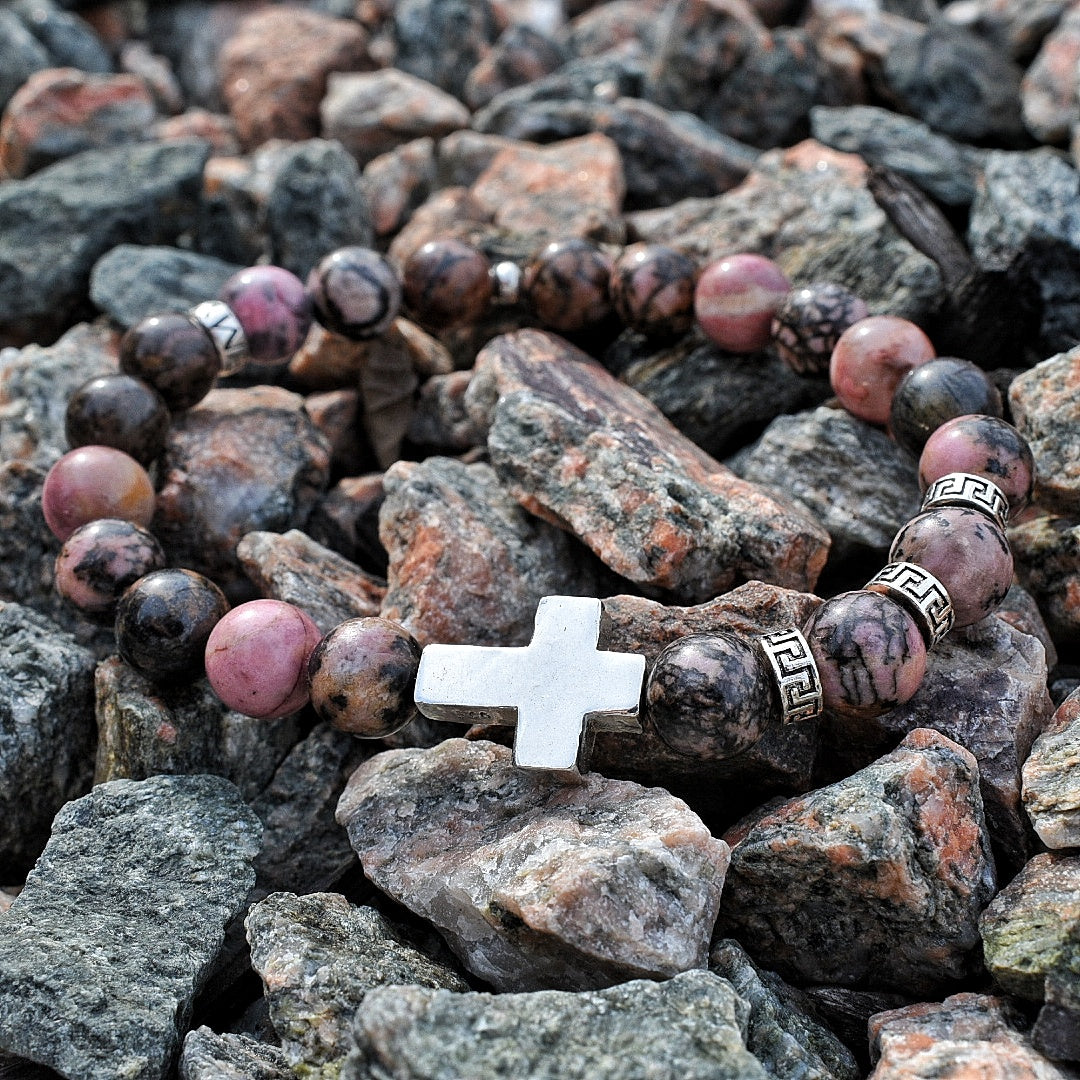 Our Premium Cross Rhodonite bracelet is completely handmade with natural 8mm Rhodonite gemstones. The focal point of this piece is the premium 925 sterling silver cross which has been accented by three pure 925 sterling silver greek spacers giving the bracelet an exquisite touch. Our signature Gemvius 24k gold vermeil spacer is added near the back as an identifier of where the piece was created.