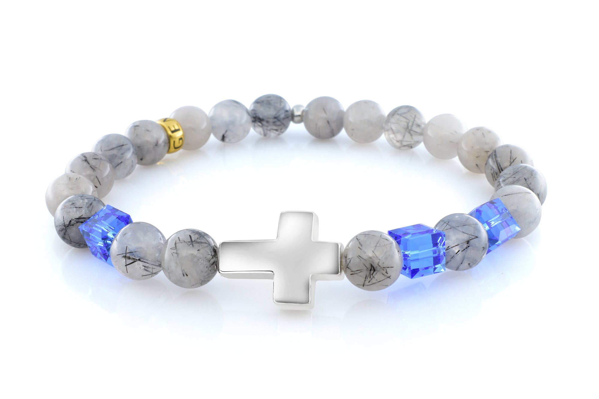 Our September Sapphire Cross Tourmalinated Quartz bracelet is completely handmade with natural 8mm Tourmalinated Quartz gemstones. This piece is designed around three stunning 6mm Swarovski sapphire crystal cubes and a premium 925 sterling silver cross. Our signature Gemvius 24k gold vermeil spacer is added near the back as a mark of where the piece was created.