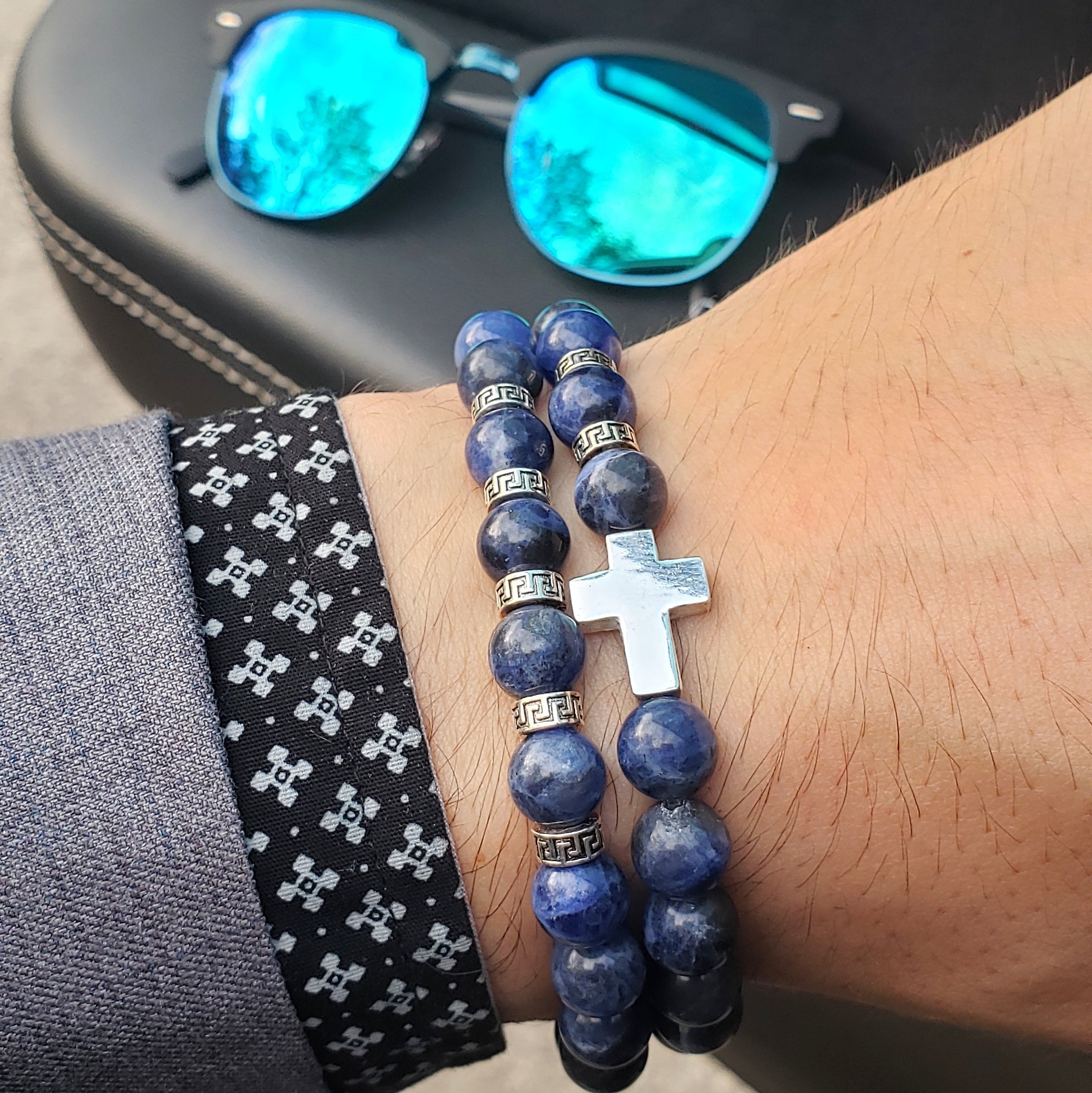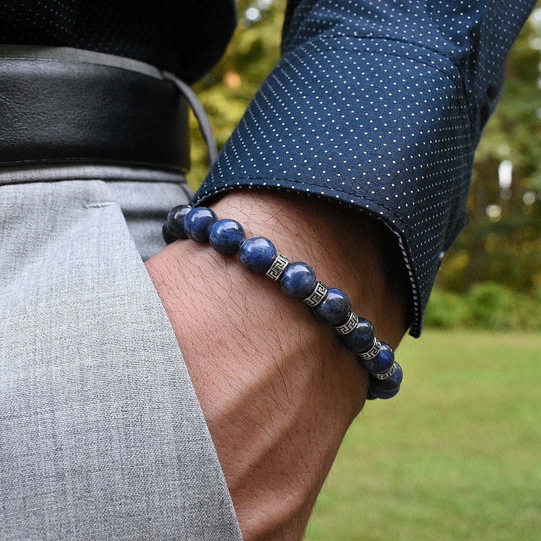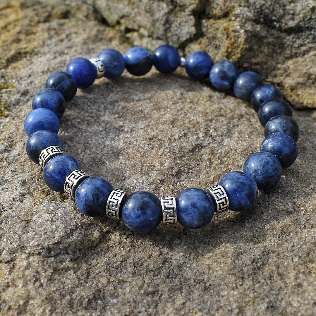 Our Penta Sodalite bracelet is completely handmade with natural 8mm Sodalite gemstones. This piece derives its name from the 5 distinct Greek spacers on the front of the bracelet. Each spacer is made of pure 925 sterling silver. Our signature Gemvius 24k gold vermeil spacer is added near the back as a mark of where the piece was created.