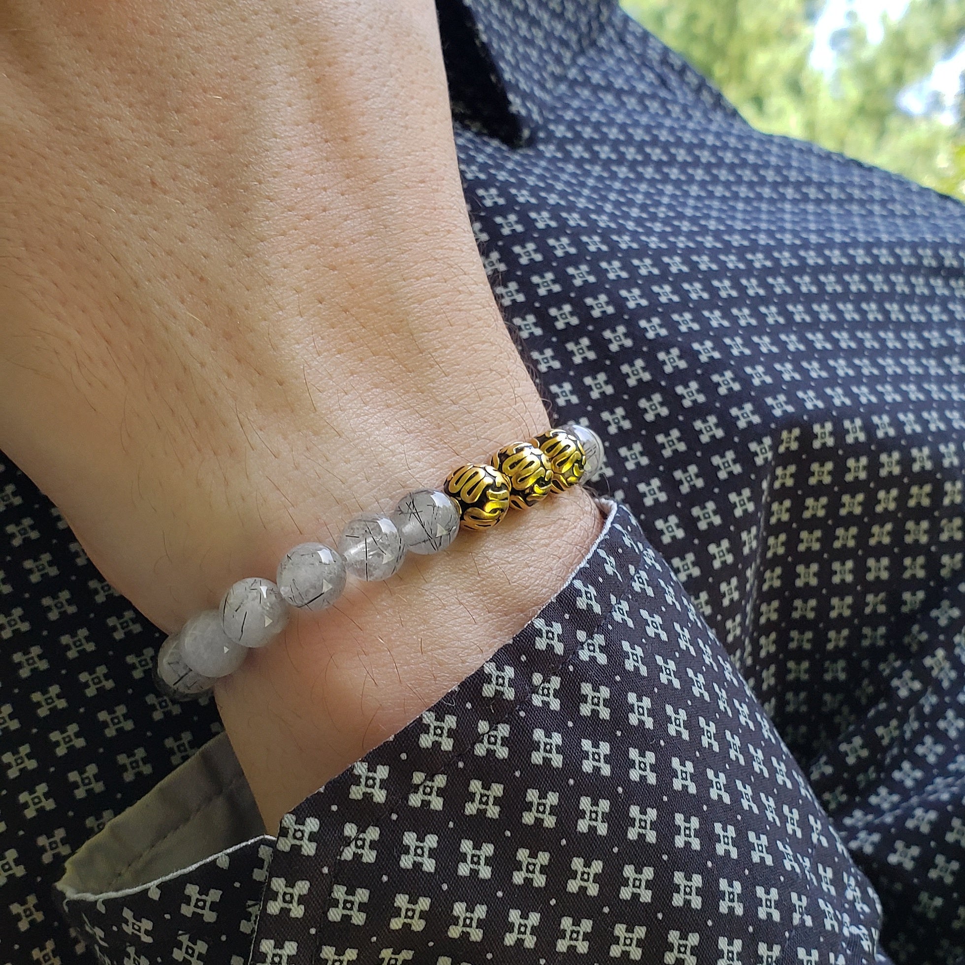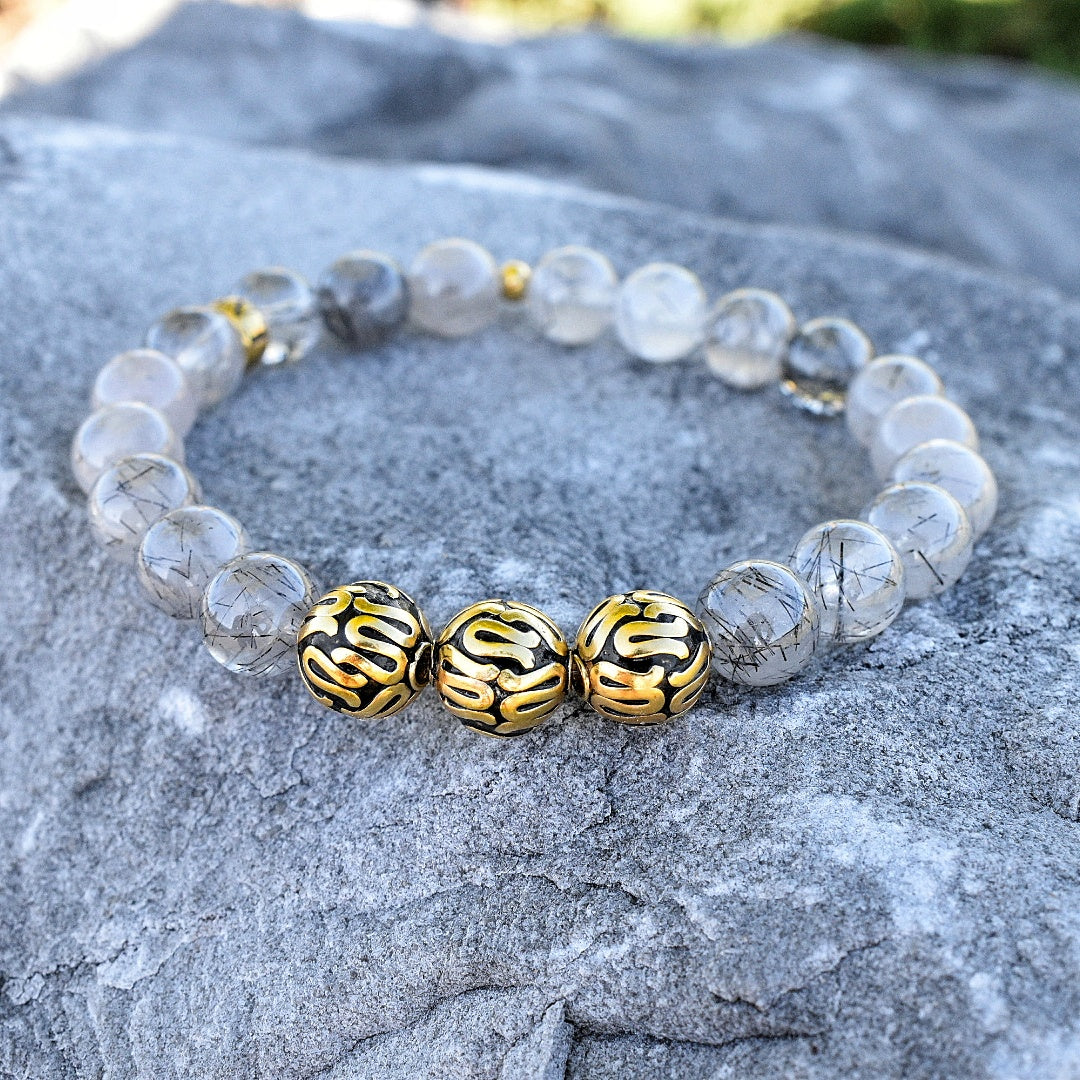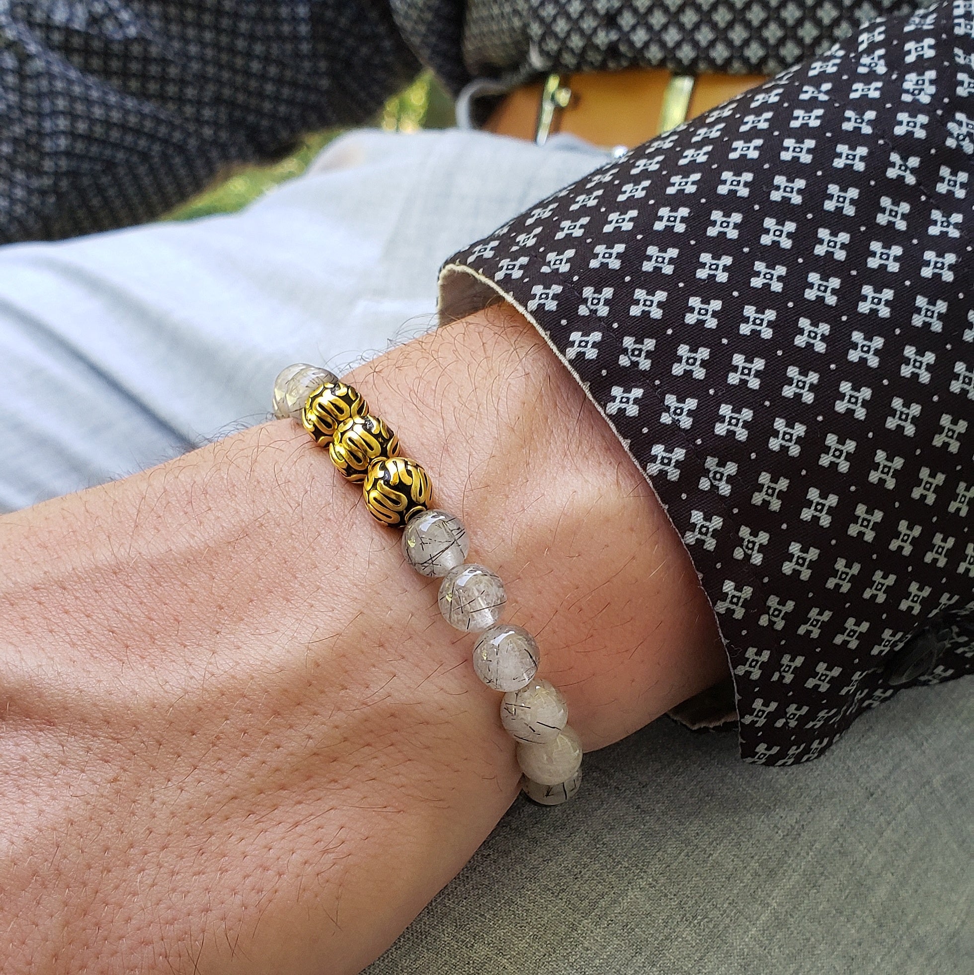 Our Gold Executive Tourmalinated Quartz bracelet is completely handmade with natural 8mm Tourmalinated Quartz gemstones. This piece is centered around the 3 premium 24k gold vermeil balls up front. Designed with luxury in mind, each handmade with pure 925 sterling silver and then layered with 24k gold. Our signature Gemvius 24k gold vermeil spacer is added near the back as a mark of where the piece was created.