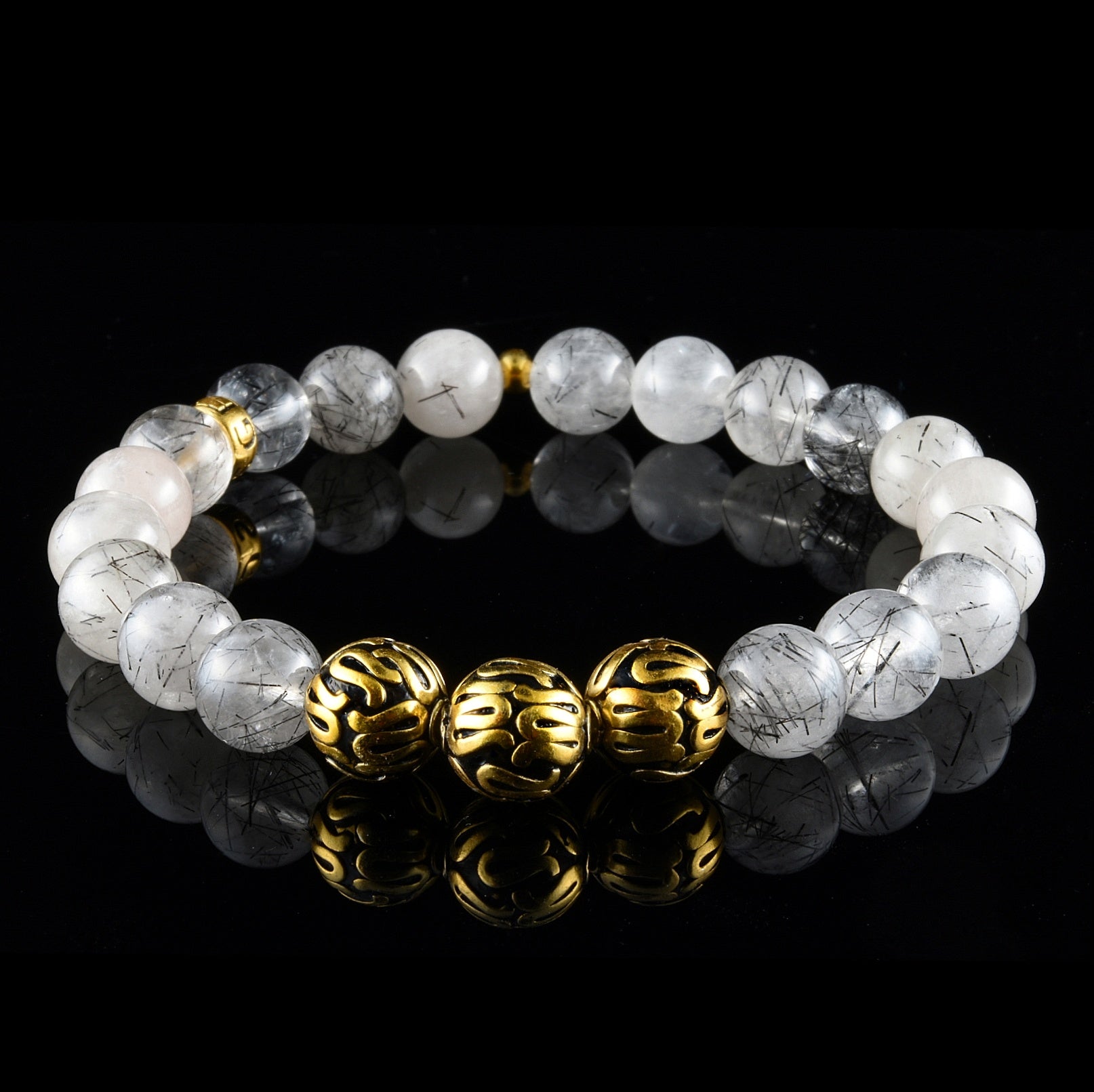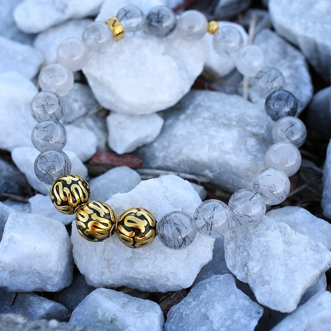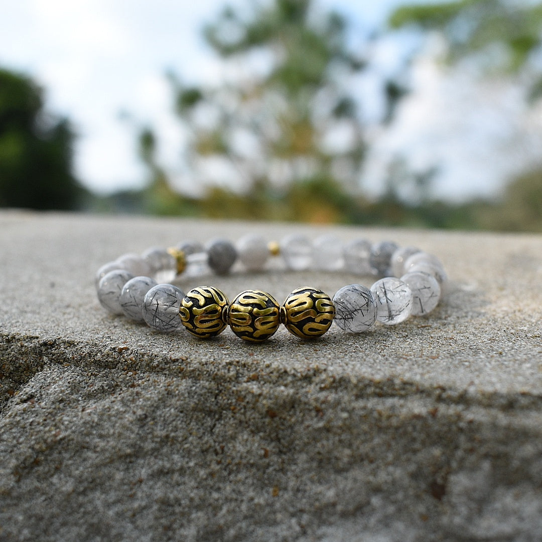 Our Gold Executive Tourmalinated Quartz bracelet is completely handmade with natural 8mm Tourmalinated Quartz gemstones. This piece is centered around the 3 premium 24k gold vermeil balls up front. Designed with luxury in mind, each handmade with pure 925 sterling silver and then layered with 24k gold. Our signature Gemvius 24k gold vermeil spacer is added near the back as a mark of where the piece was created.