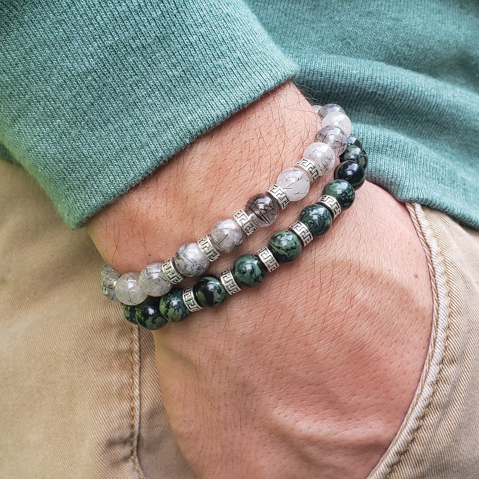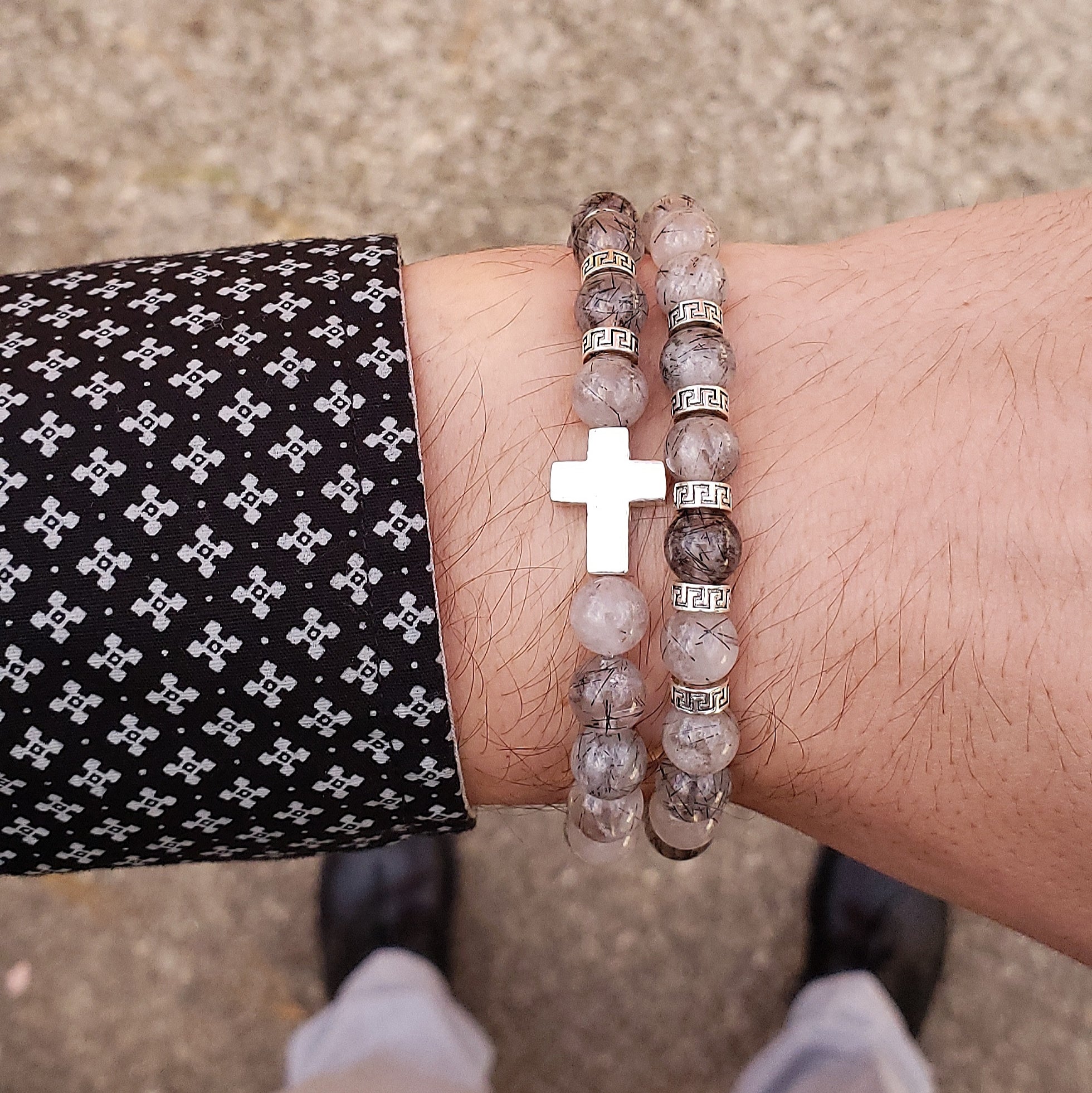 Our Penta Tourmalinated Quartz bracelet is completely handmade with natural 8mm Tourmalinated Quartz gemstones. This piece derives its name from the 5 distinct Greek spacers on the front of the bracelet. Each spacer is made of pure 925 sterling silver. Our signature Gemvius 24k gold vermeil spacer is added near the back as a mark of where the piece was created.