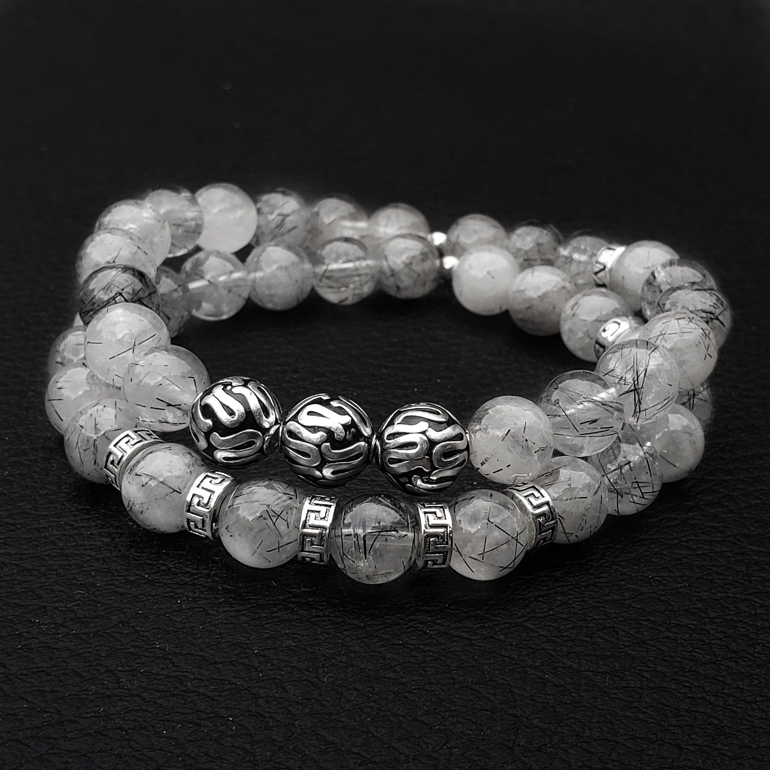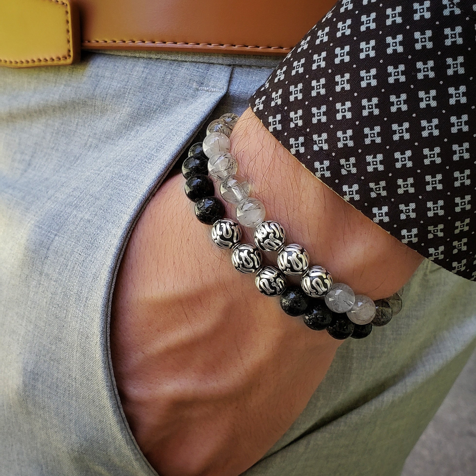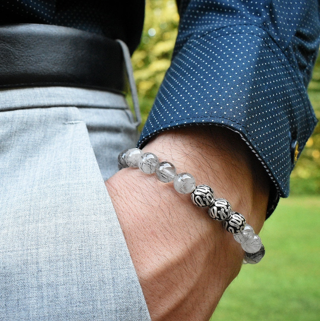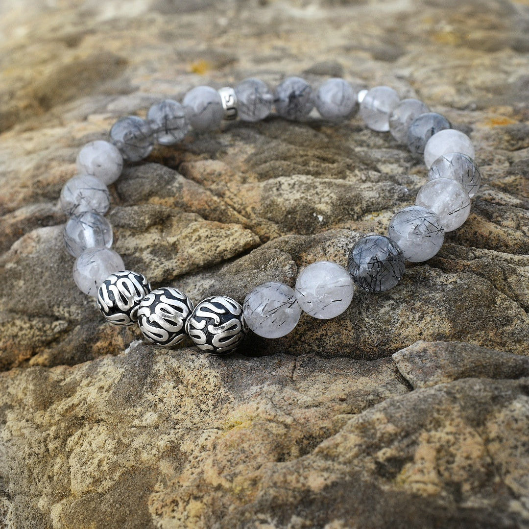 Our Silver Executive Tourmalinated Quartz bracelet is completely handmade with natural 8mm Tourmalinated Quartz gemstones. This piece is centered around the 3 premium pure 925 Sterling Silver balls up front. Each ball is 100% handcrafted by highly skilled artisans from Bali. Our signature Gemvius 24k gold vermeil spacer is added near the back as a mark of where the piece was created.
