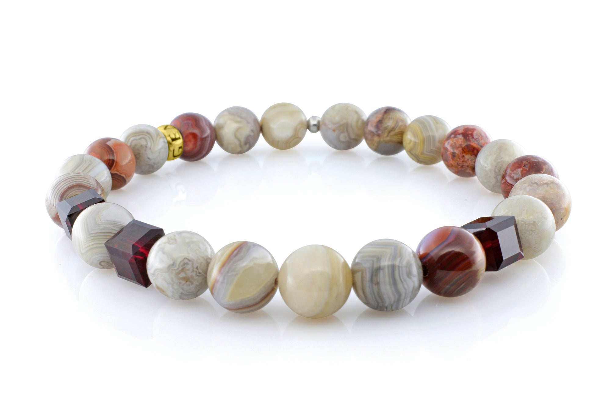 Our January Garnet Mexican Agate bracelet is completely handmade with natural 8mm Mexican Agate gemstones. This piece is designed around three stunning 6mm Swarovski garnet crystal cubes. Each crystal cut and polished to perfection. Our signature Gemvius 24k gold vermeil spacer is added near the back as a mark of where the piece was created.