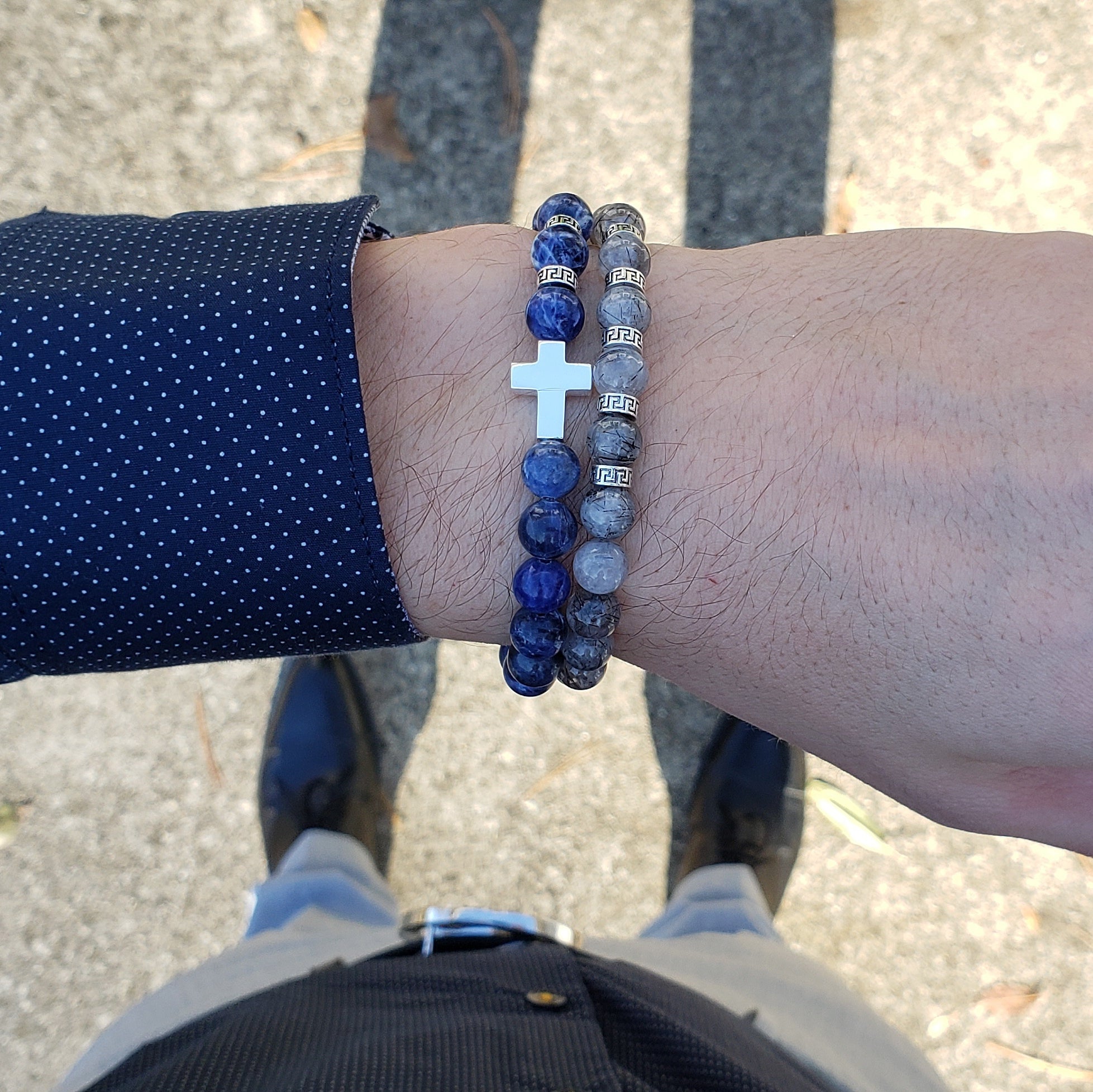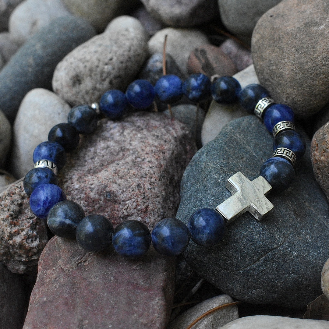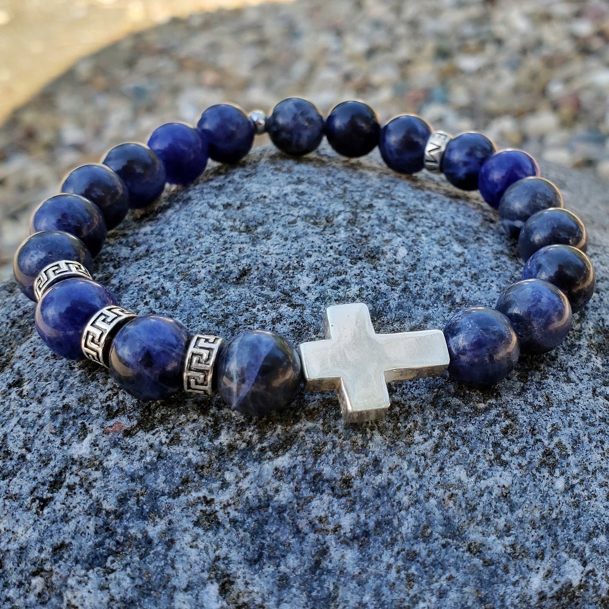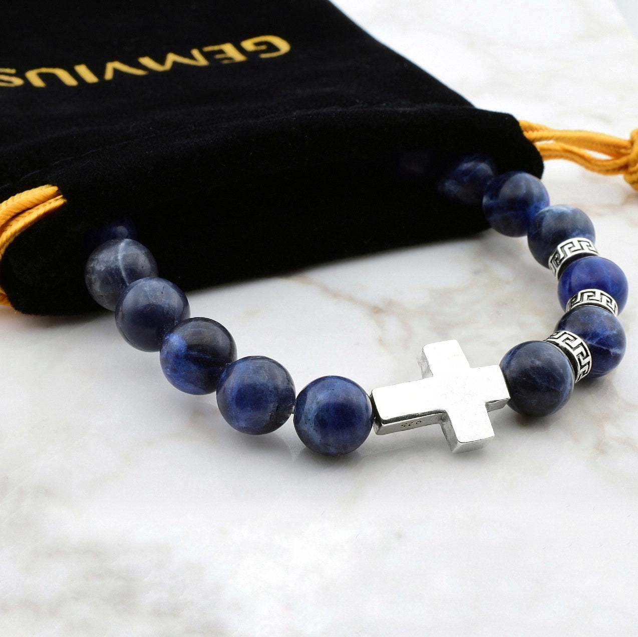 Our Premium Cross Sodalite bracelet is completely handmade with natural 8mm Sodalite gemstones. The focal point of this piece is the premium 925 sterling silver cross which has been accented by three pure 925 sterling silver greek spacers giving the bracelet an exquisite touch. Our signature Gemvius 24k gold vermeil spacer is added near the back as an identifier of where the piece was created.